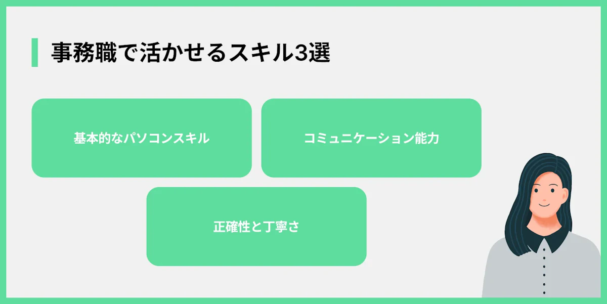「未経験だけど、どんなスキルがあればアピールできるんだろう?」と気になりますよね。事務職で求められる代表的なスキルを3つご紹介します。特別なスキルだけでなく、普段から意識できることもありますよ。