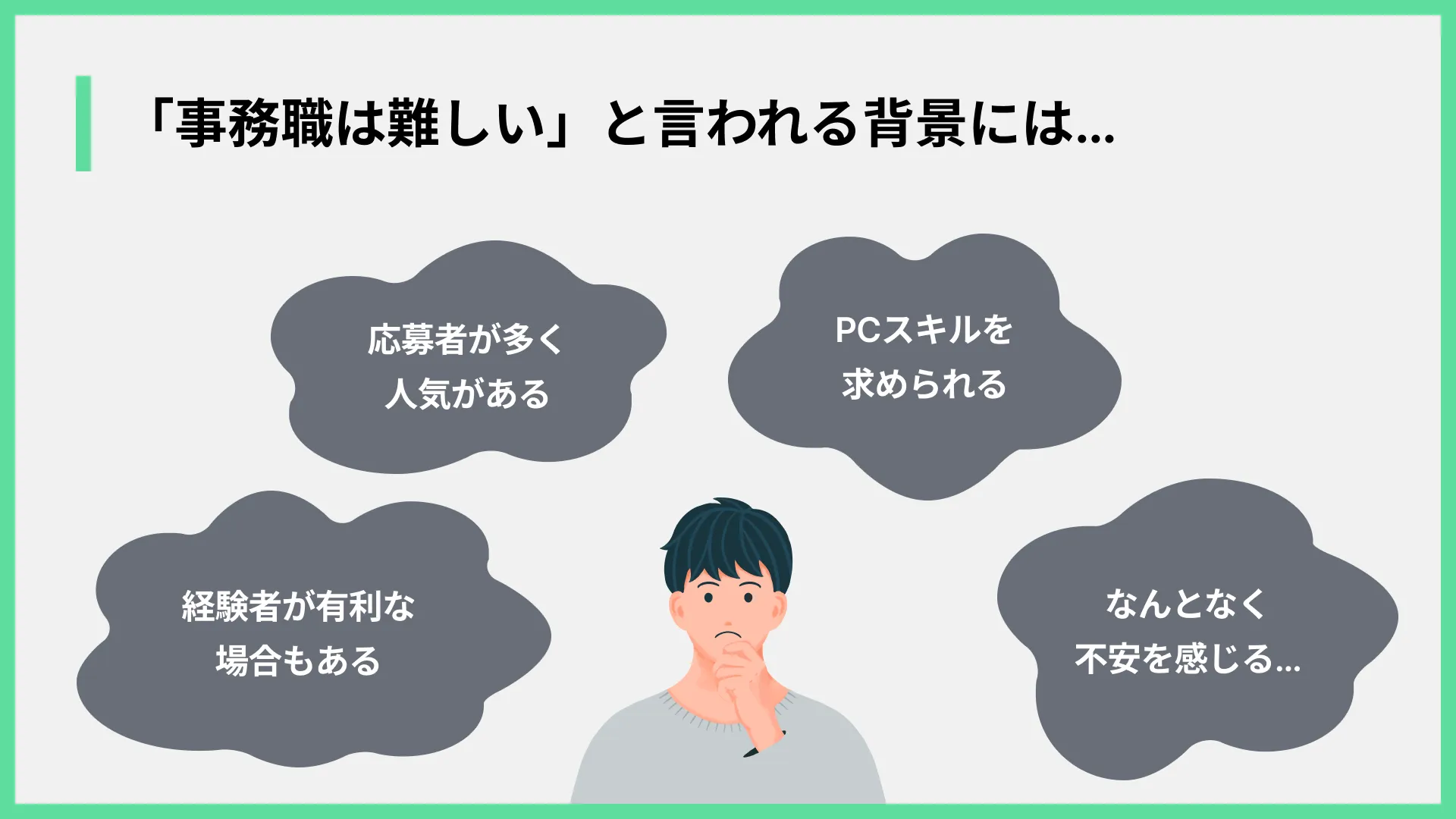 一方で、「事務職は人気だから倍率が高い」「高卒だと難しい」なんて声を聞くこともあるかもしれません。それはなぜでしょうか?