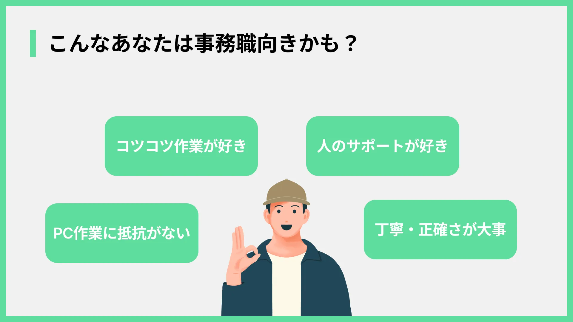 もちろん、これらに当てはまらなくても、事務職として活躍している人はたくさんいます。「やってみたい!」という気持ちがあれば、ぜひチャレンジしてみてくださいね。