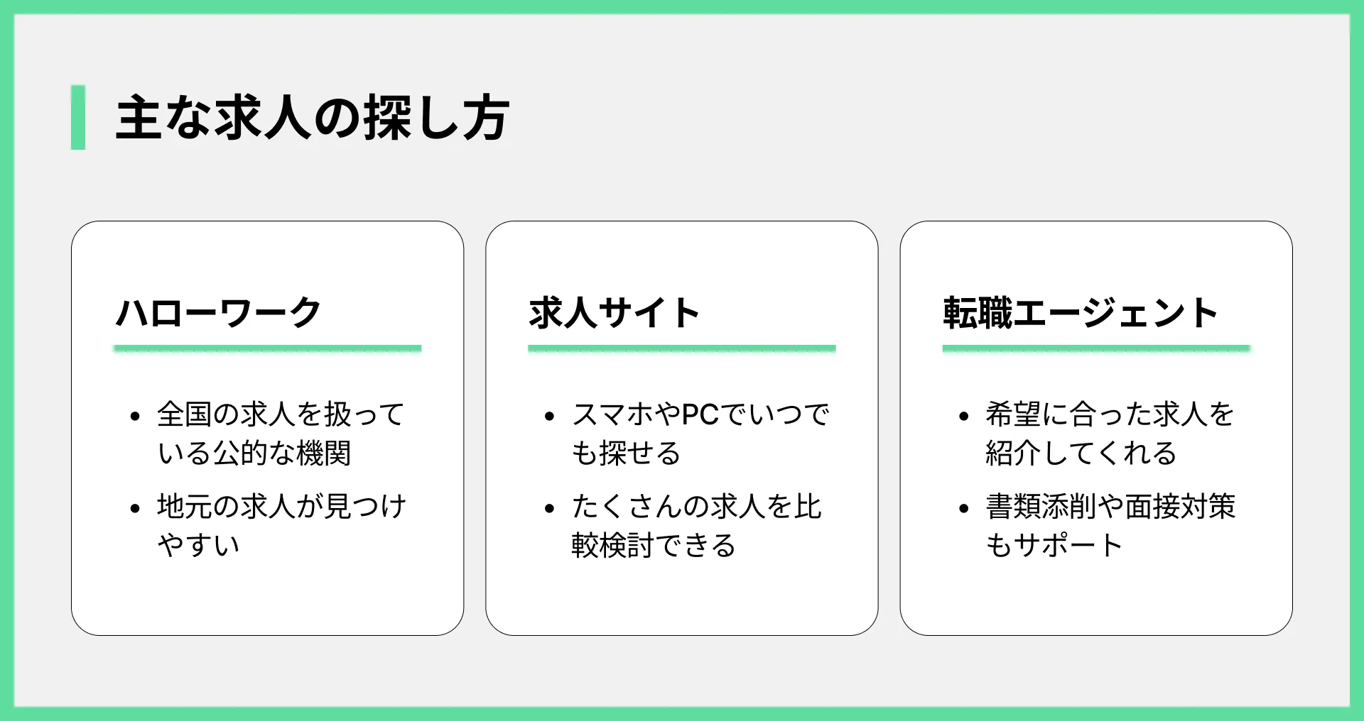自己分析と情報収集がある程度できたら、次は実際に求人を探します。求人を探す方法は主に以下の3つです。