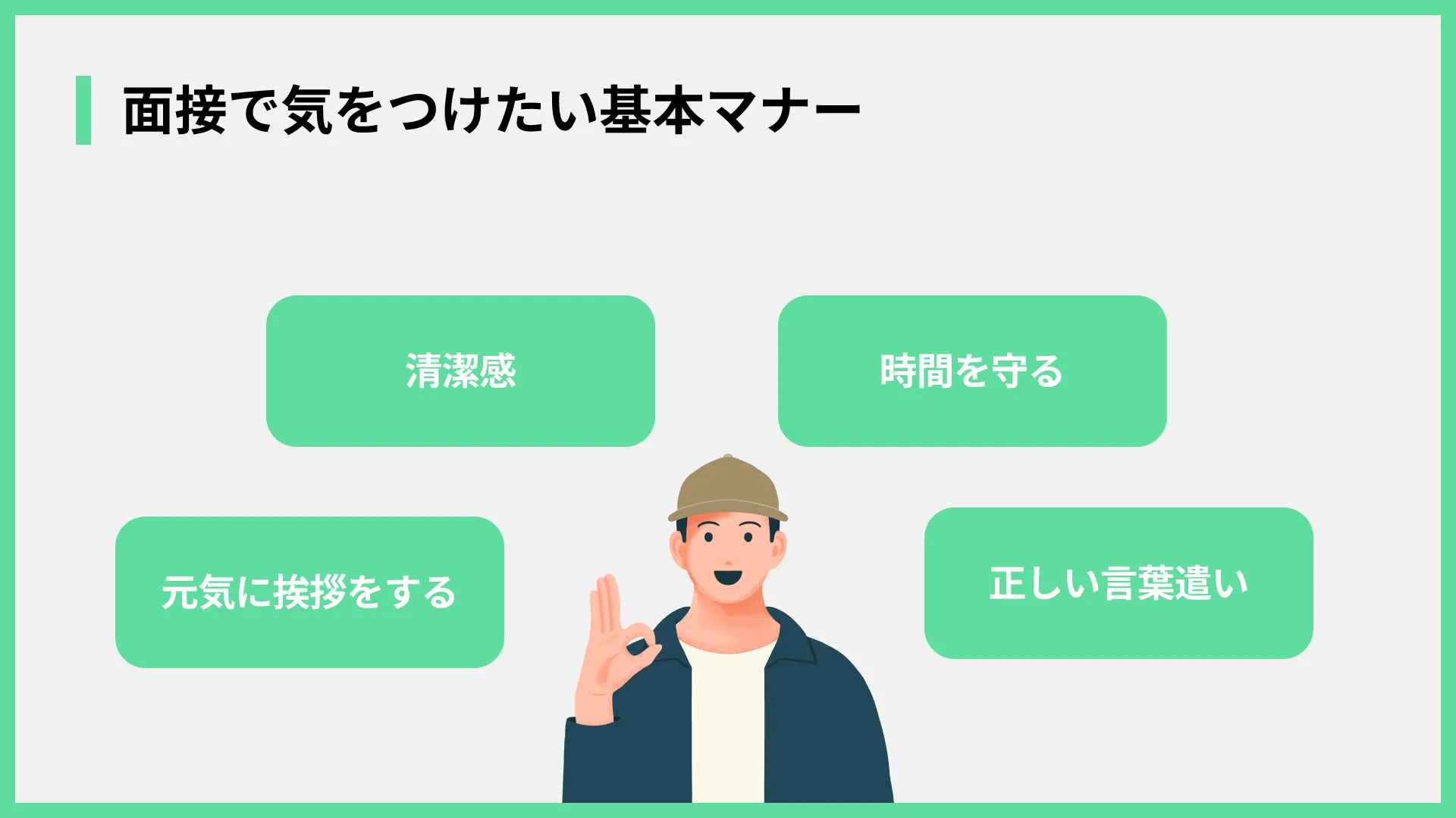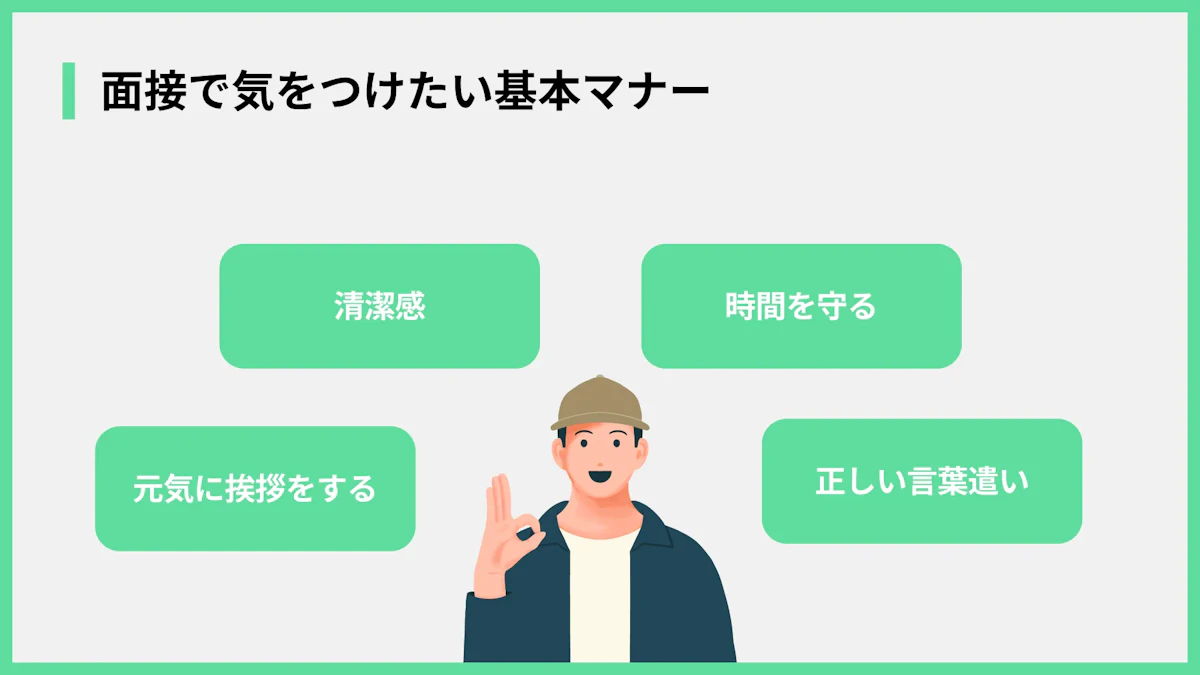 - 言葉遣いや身だしなみなど、基本的なマナーが大切