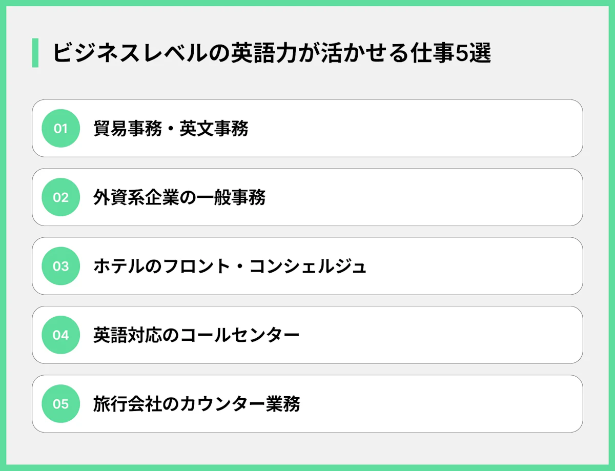 ペラペラに話せなくても大丈夫な仕事もあれば、ビジネスレベルの高い英語力が求められる仕事もあります。まずは、どんな仕事でどのくらいの英語力が必要なのか、目安を知っておきましょう。