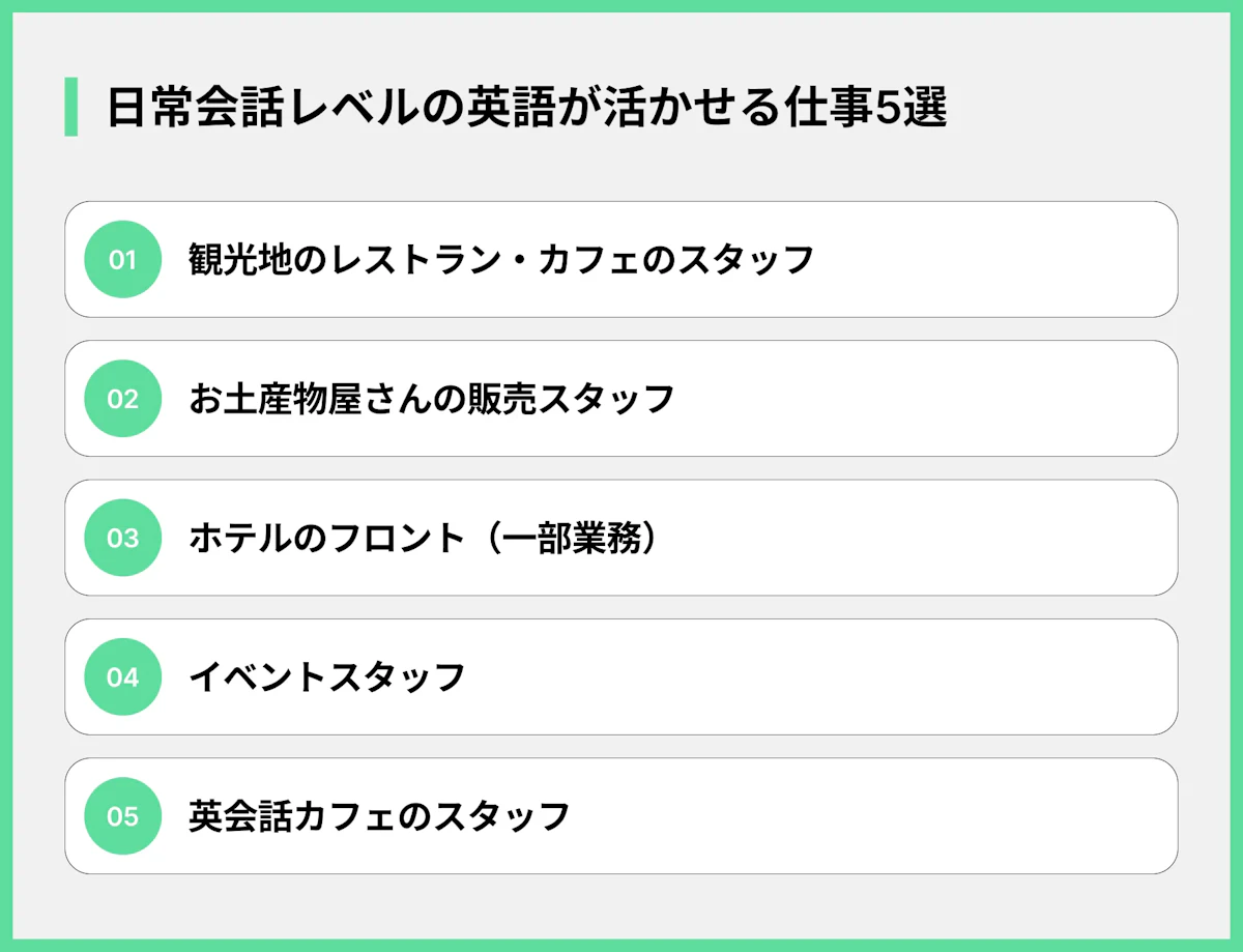 ・レストラン・カフェスタッフ:注文取り、メニュー説明、会計など(特に外国人客が多いお店)。