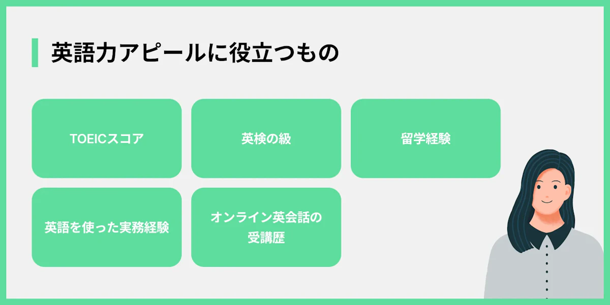 資格がなくても、「海外ドラマを字幕なしで見られる」「オンライン英会話で日常会話は問題なくできる」「留学先で現地の友人とコミュニケーションをとっていた」など、具体的なエピソードで英語力を伝えることができます。