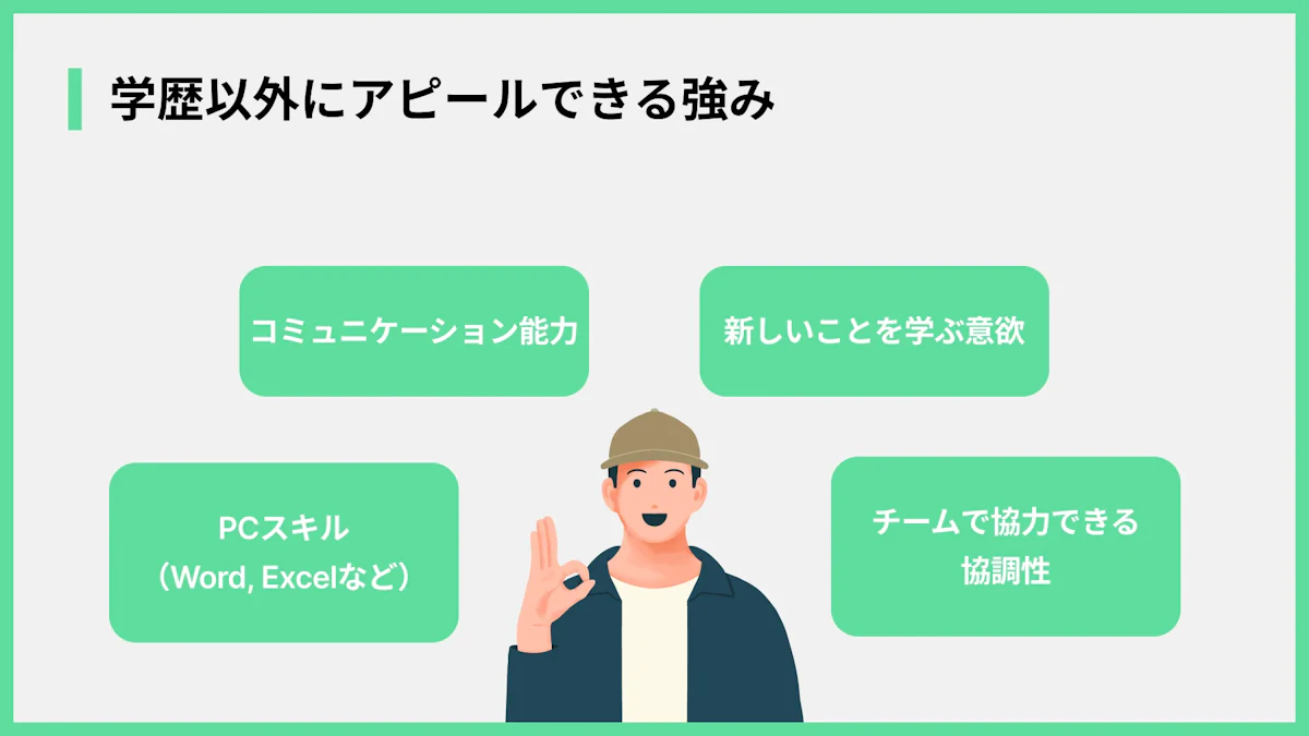 特に、コミュニケーション能力や、新しいことを吸収しようとする前向きな姿勢は、どんな仕事でも高く評価されます。「早く仕事を覚えて貢献したい」という意欲を伝えることが大切です。
