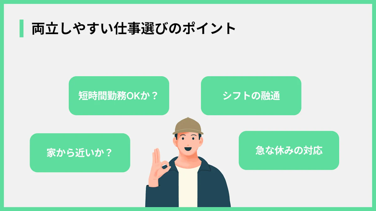 仕事を探す際には、「子育て中のスタッフが活躍中」「急なお休みにも対応します」といった記載があるかどうかもチェックしてみましょう。面接で、家庭との両立について相談してみるのも良い方法です。