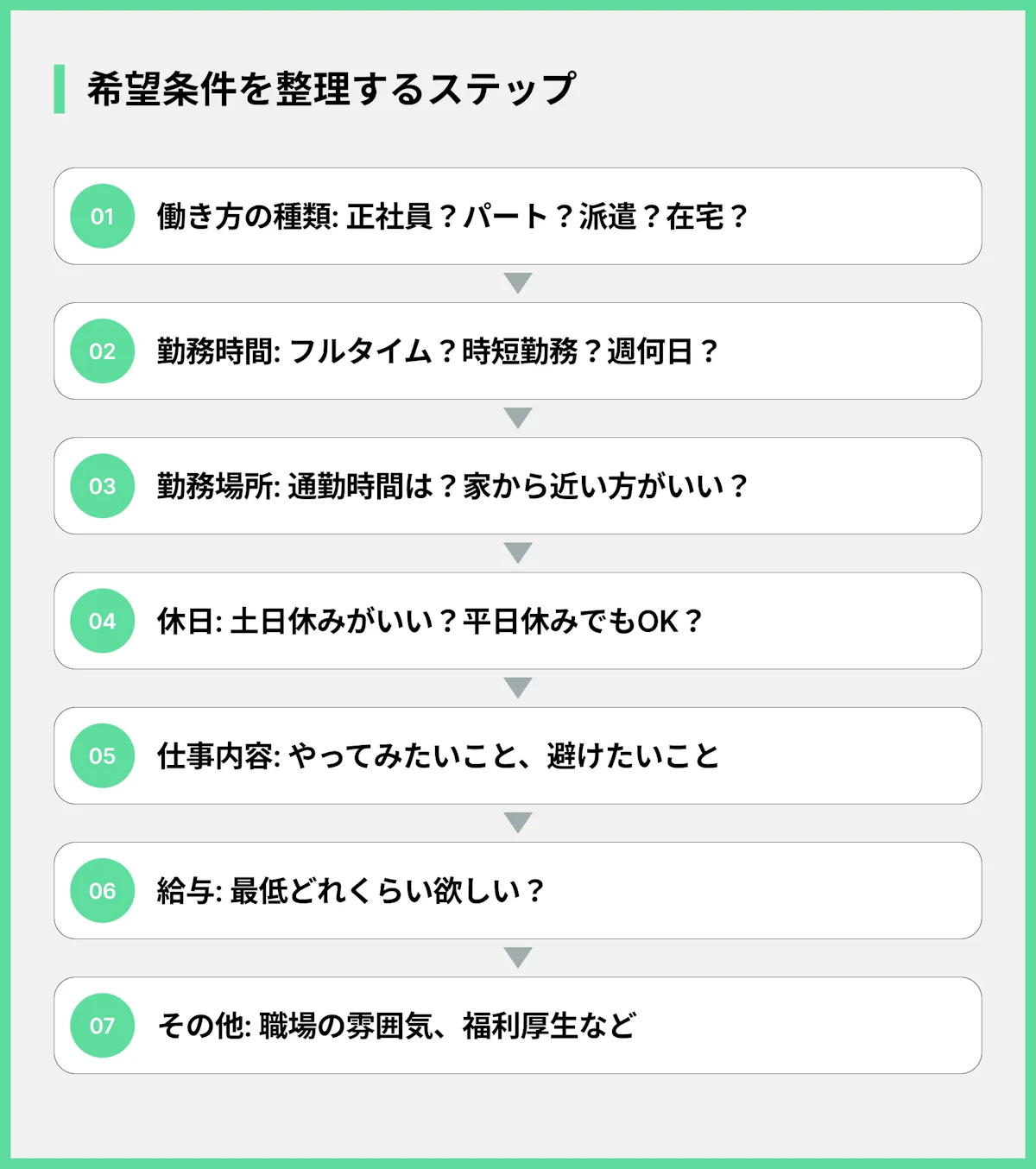 次に、どんな働き方をしたいか、具体的な希望条件を整理してみましょう。これも、仕事を探す上での大切な道しるべになります。