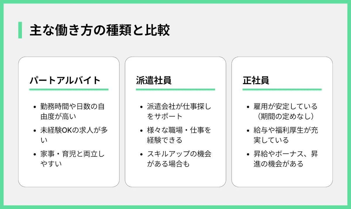 仕事を探すとき、求人票には「パート」「派遣」「正社員」など、いろいろな働き方(雇用形態)が書かれています。それぞれに特徴があるので、違いを知っておくと、自分に合った働き方を選びやすくなります。