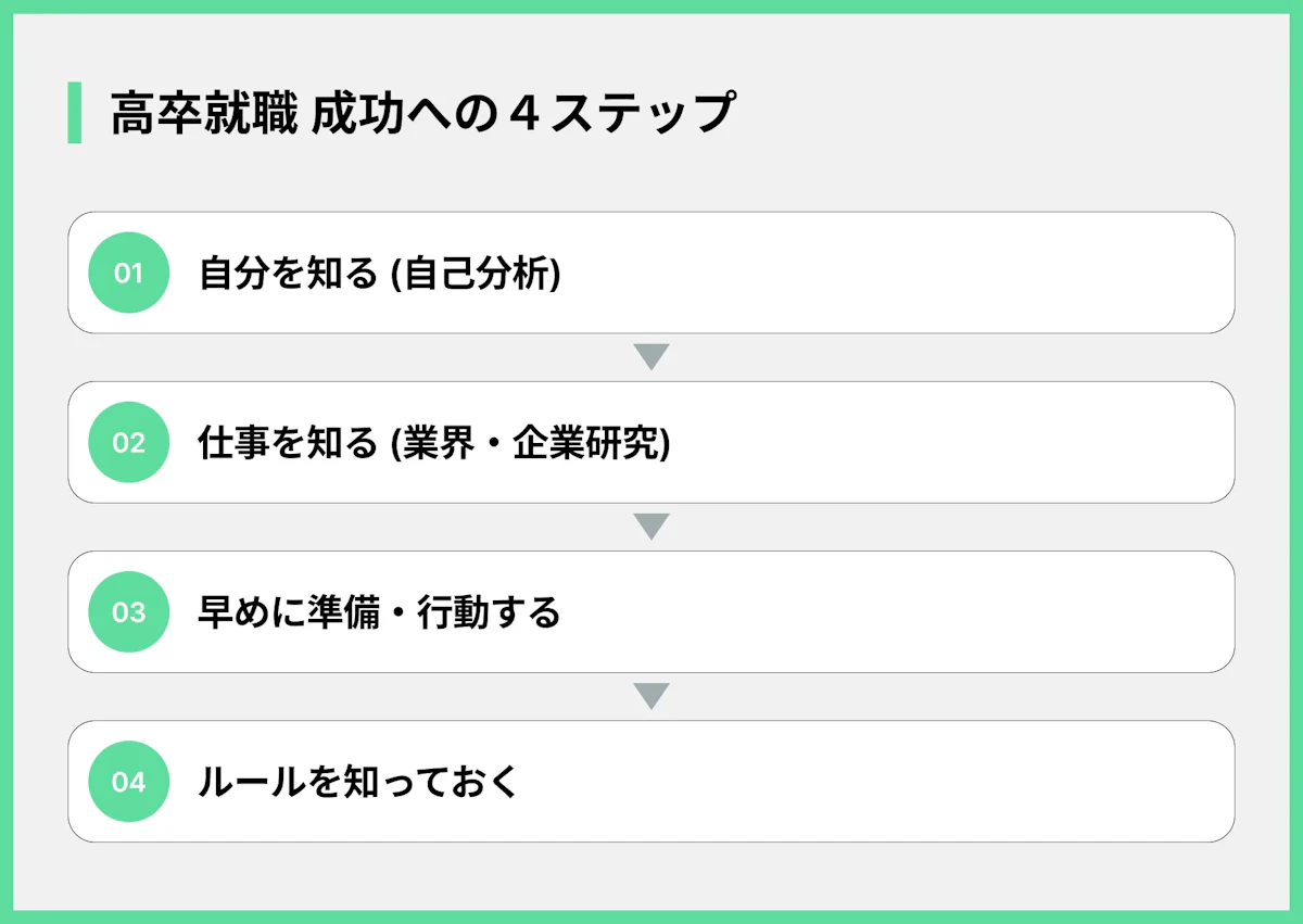 支援サービスをうまく活用することも大切ですが、就職活動を成功させるためには、あなた自身の準備と行動も欠かせません。ここでは、高卒就職を成功させるための4つのポイントをご紹介します。
