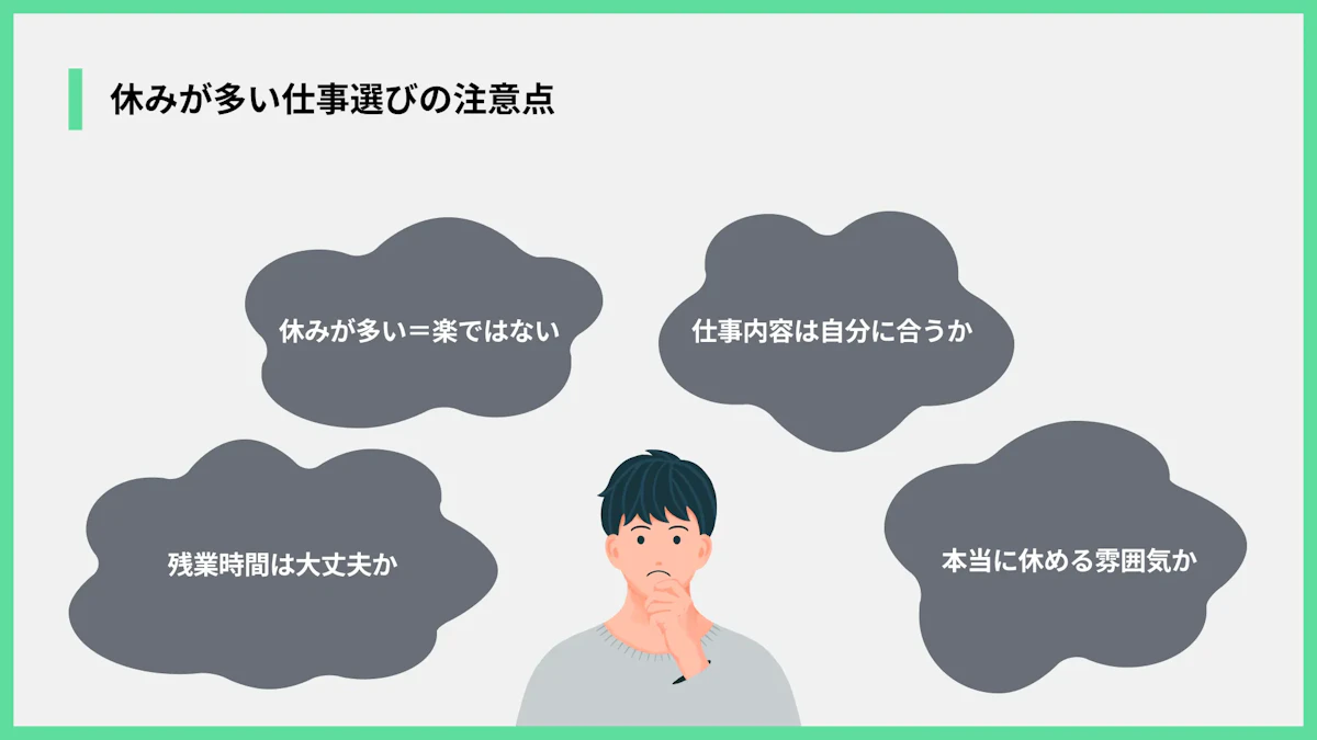 休みが多い仕事は魅力的ですが、飛びつく前にいくつか注意しておきたいポイントがあります。