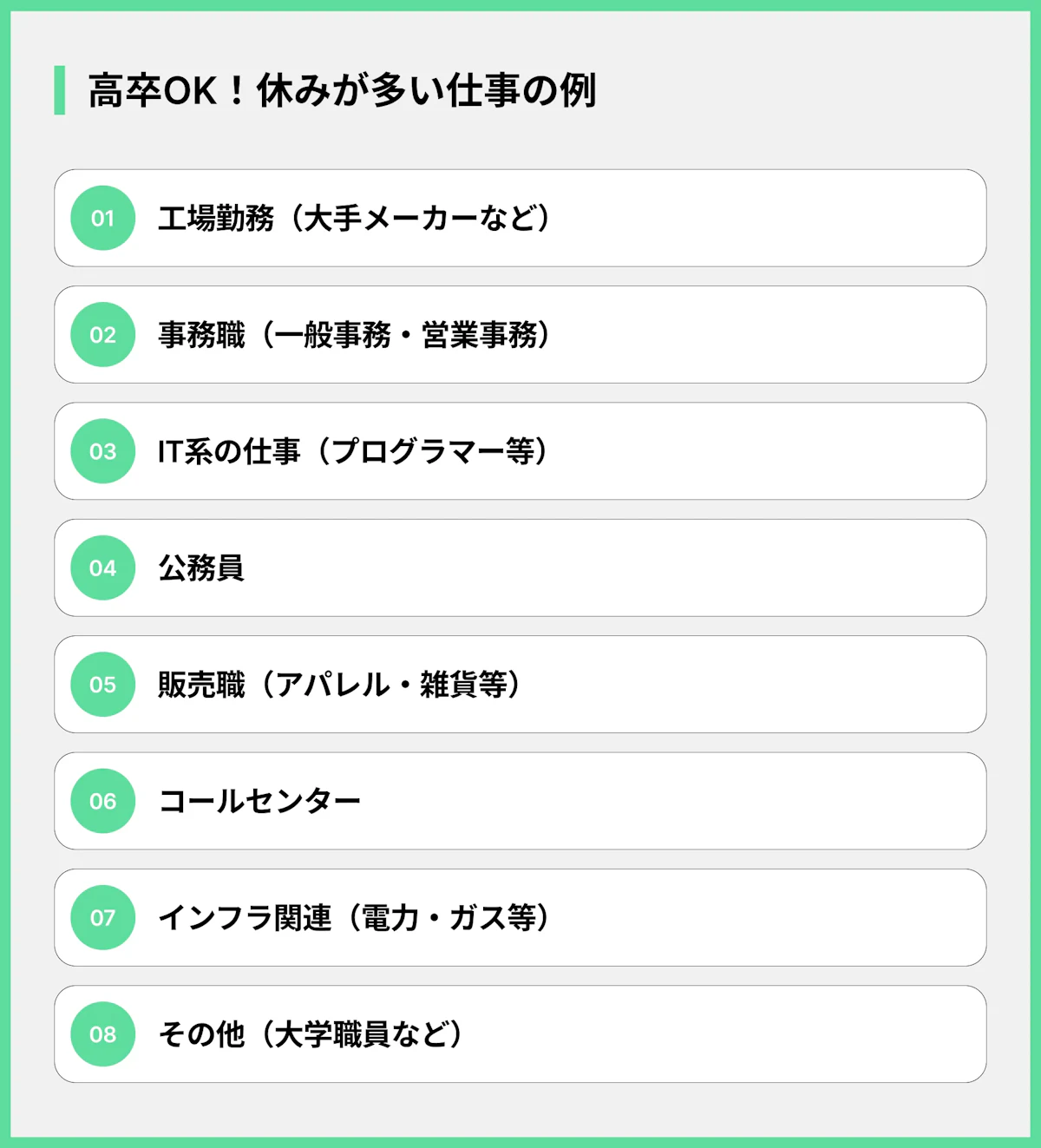 「休日のことは分かったけど、じゃあ具体的にどんな仕事が高卒でもOKで休みが多いの?」