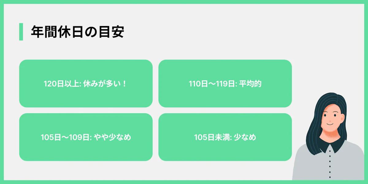 ・「年間休日120日以上」「完全週休2日制」などが目安になる