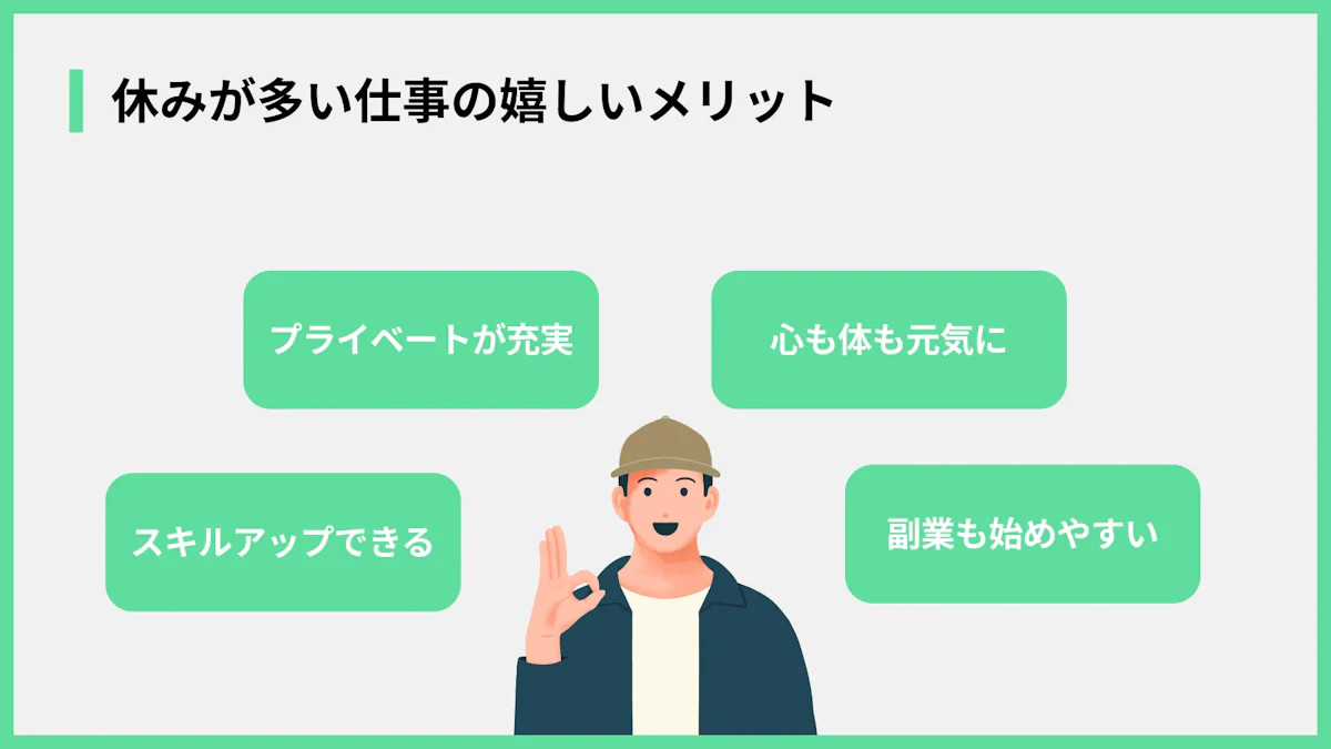・休みが多いとプライベート充実、心身の健康、スキルアップなどのメリットがある