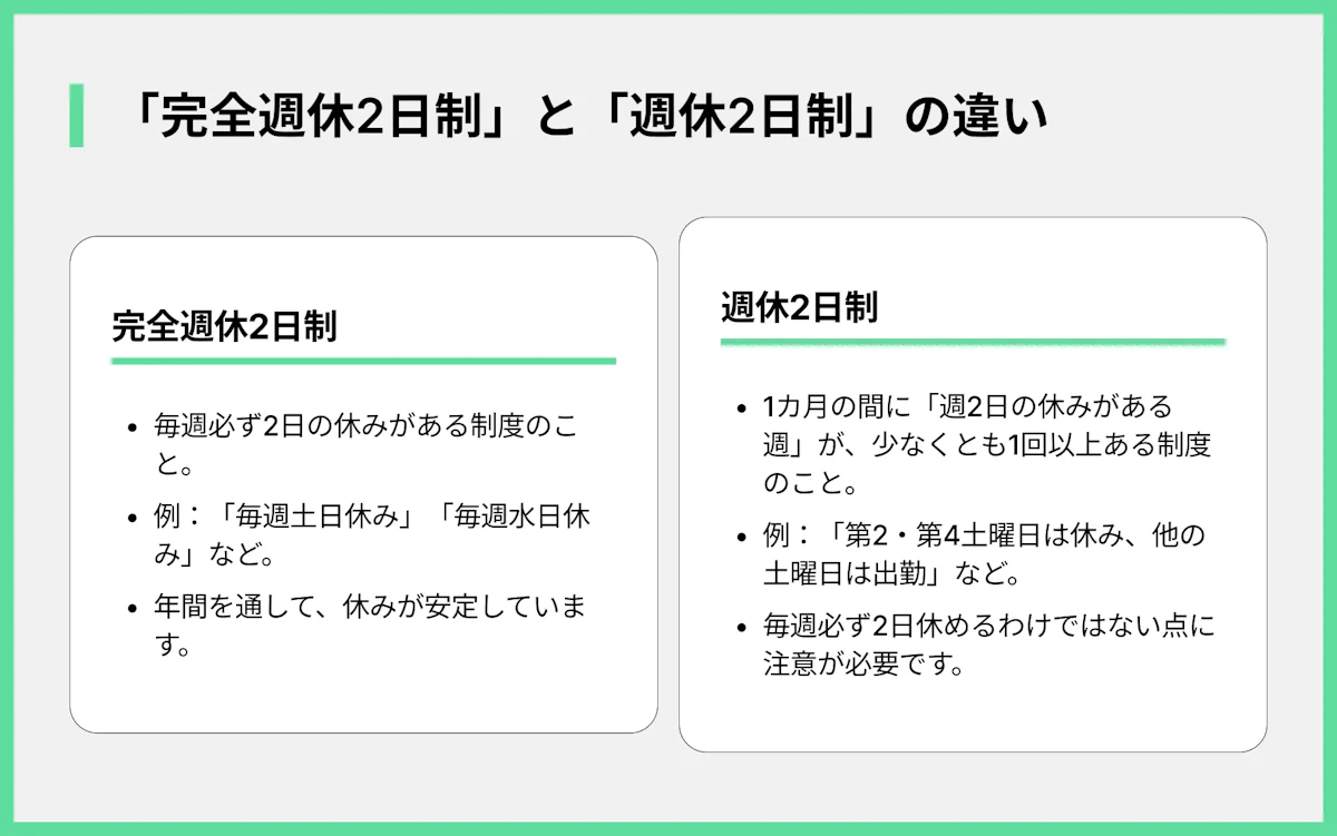 求人票でよく見かける「完全週休2日制」と「週休2日制」。似ているようで、実は意味が違います。この違いを知らないと、「思っていたより休みが少ない…」なんてことになりかねません。