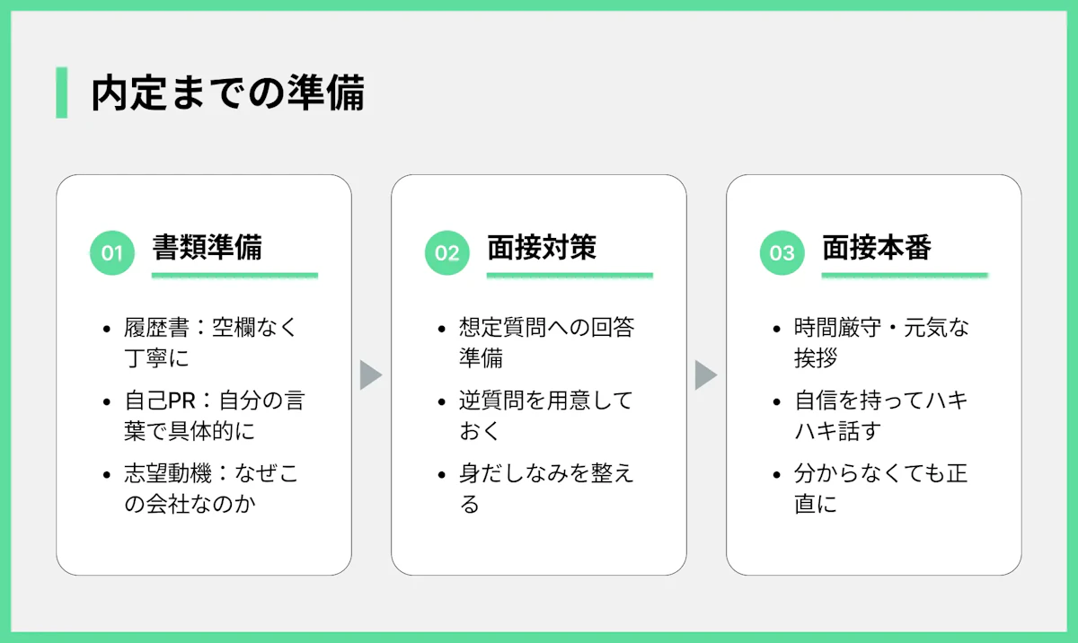面接は、企業があなたの人柄や意欲を直接見る場であり、あなたも企業の雰囲気を知るチャンスです。自信を持って臨めるように、しっかり準備しましょう。