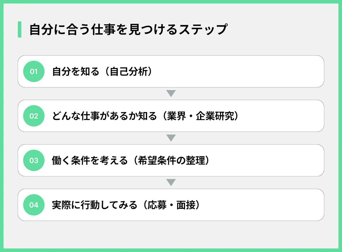 自分にぴったりの仕事を見つけるためには、いくつかステップがあります。