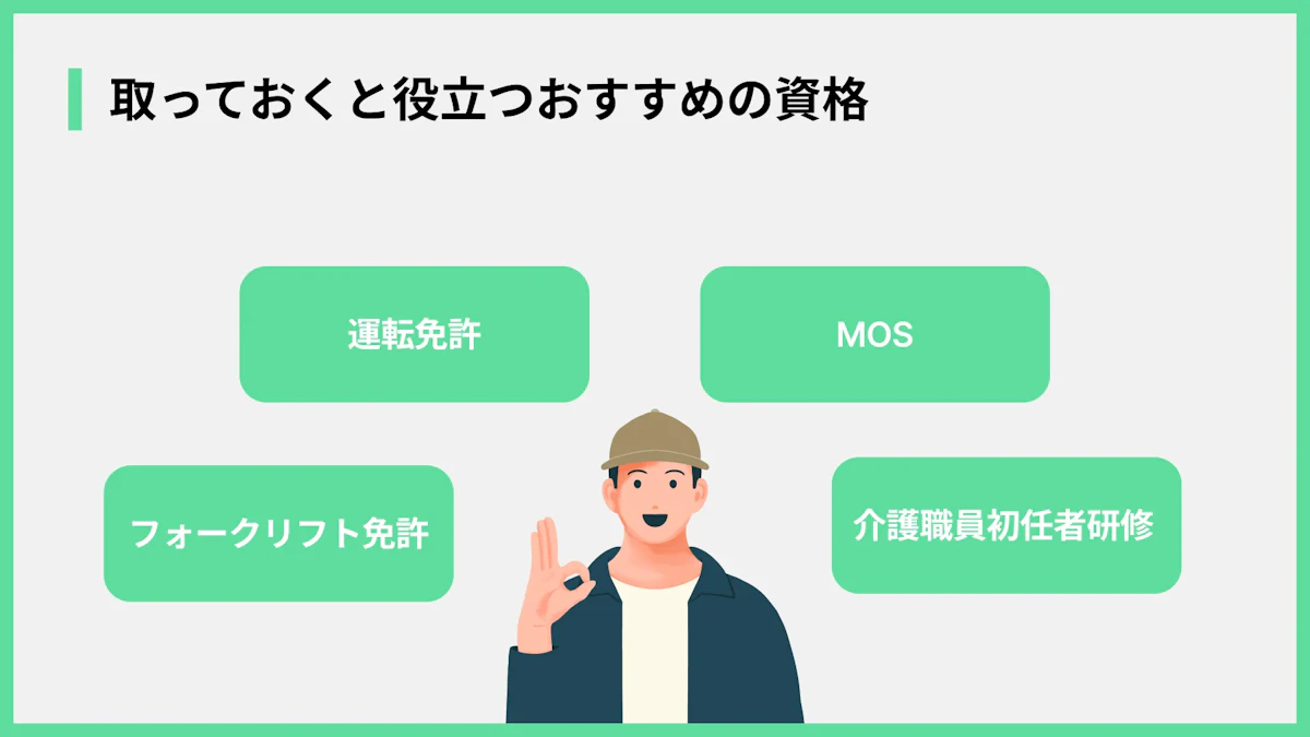 もちろん、資格がなくても就職できる仕事はたくさんありますが、もし余裕があれば、持っていると選択肢が広がったり、少しだけ就職活動が有利になったりする可能性のある資格もあります。