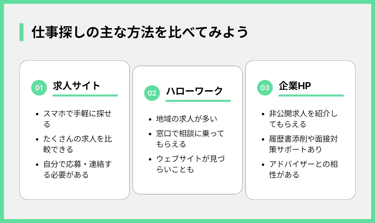 自分に合いそうな仕事のイメージが少し見えてきたら、いよいよ具体的な仕事探しスタートです!