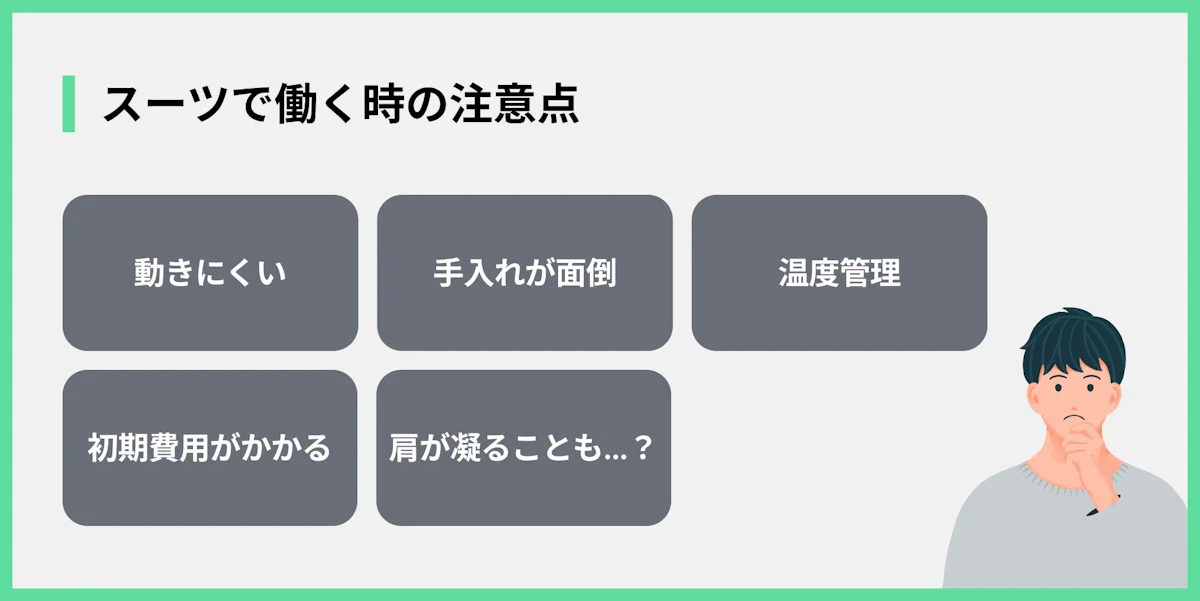 - 動きにくさ・窮屈さ:特に体を動かす場面では、スーツだと動きにくいと感じることがあります。満員電車での通勤なども、少し窮屈に感じるかもしれません。