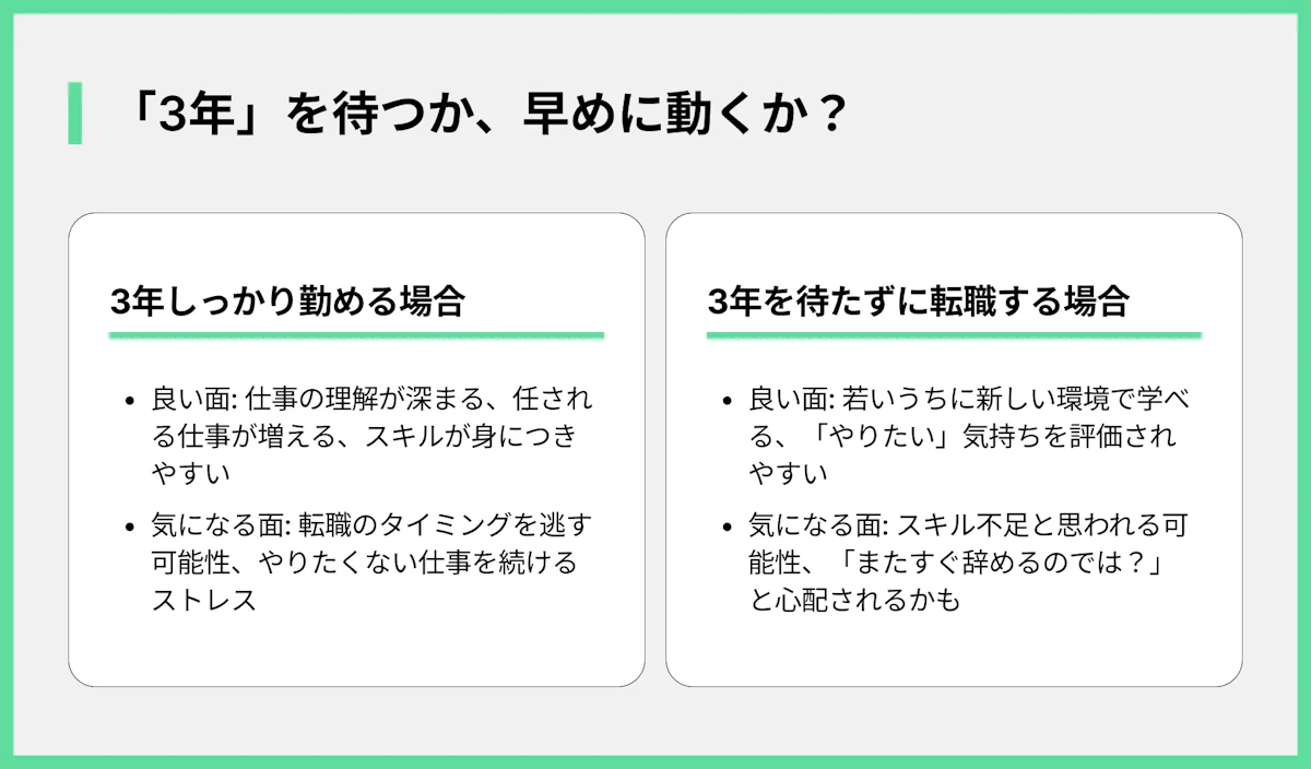 どちらが良いかは、あなたの状況や考え方によって違います。「3年」という数字にとらわれすぎず、今の自分がどうしたいのか、将来どうなりたいのかを考えることが大切です。