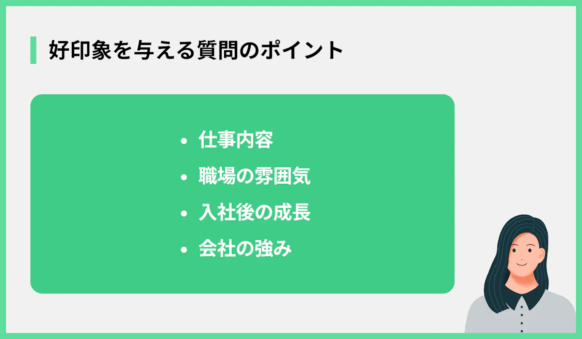 - 好印象を与える逆質問の具体例