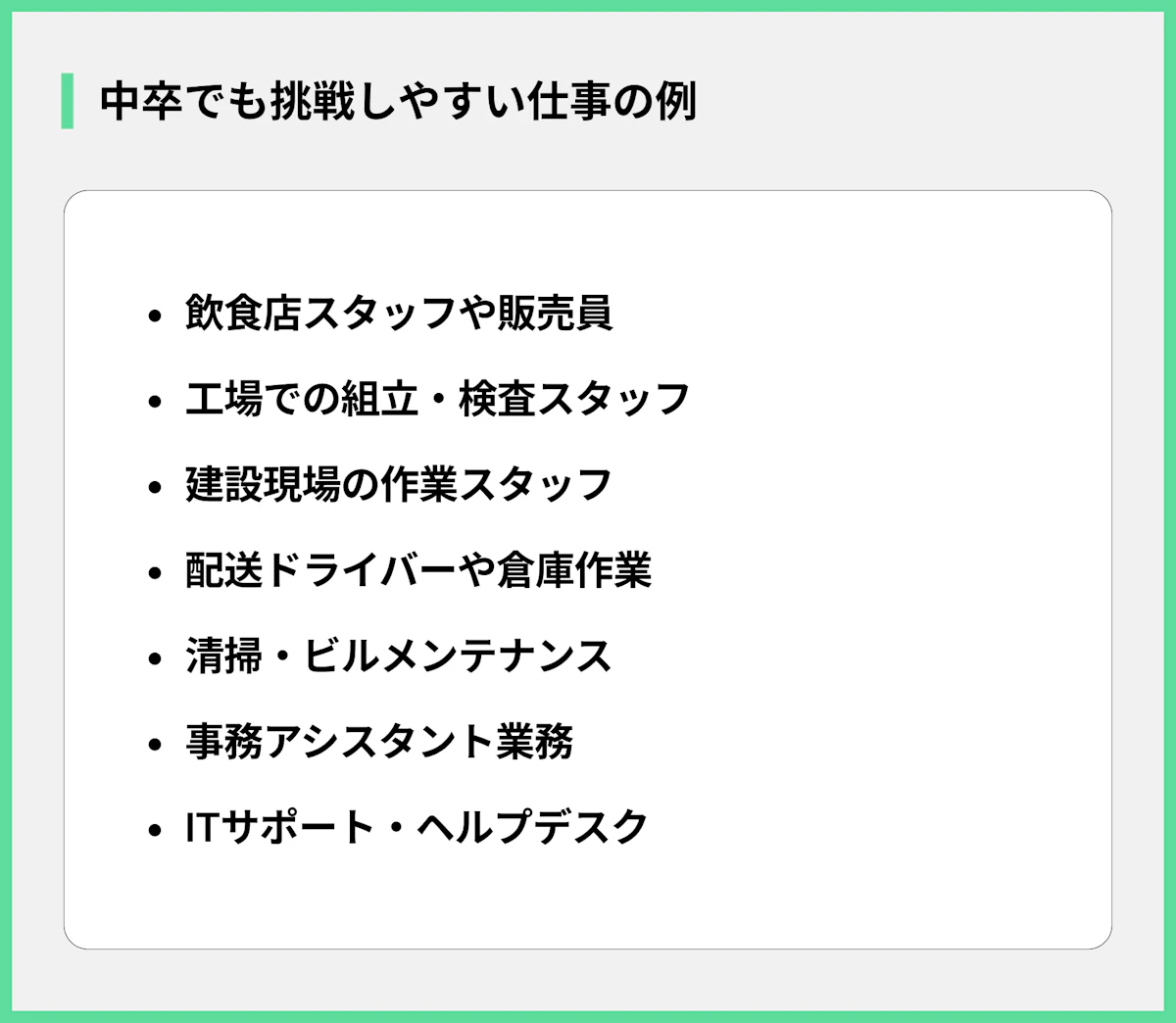 例えば、飲食店スタッフや販売員、工場での作業スタッフ、建設現場の作業員、配送ドライバー、清掃スタッフなど、体を動かす仕事や、人と接する仕事が多く見られます。最近では、基本的なパソコンスキルがあれば挑戦できる事務アシスタントや、IT業界でのサポート業務などの求人も出てきています。