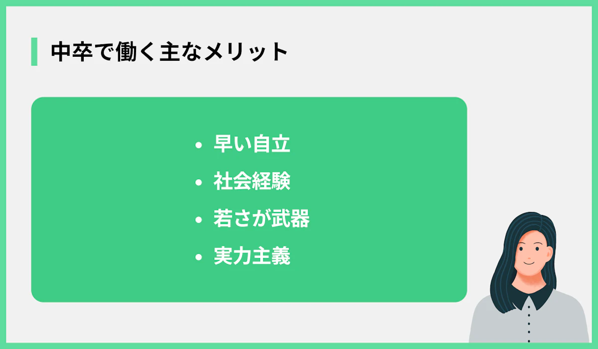 中卒で働くことには、実はいくつかのメリットがあります。「学歴がないと不利なのでは…」と思っている人もいるかもしれませんが、早くから社会に出るからこその強みもあるのです。ここでは、中卒で働くことのメリットについて、以下の2つのポイントで解説します。