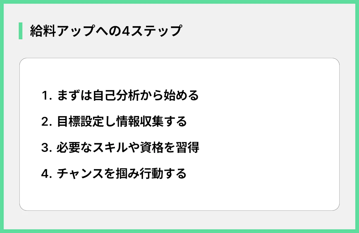 「中卒だけど、もっと給料を上げたい!」そう思うのは自然なことです。学歴に関わらず、努力次第で収入をアップさせることは可能です。ここでは、給料を上げるための具体的なステップについて、以下の4つの項目で解説します。