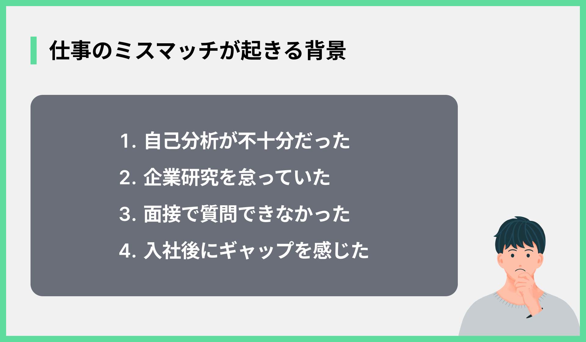 任されている仕事が、自分のスキルと合っていない場合も、仕事が進まず手持ち無沙汰になりがちです。これは、仕事内容とのミスマッチが原因と言えます。例えば、仕事が簡単すぎてすぐに終わってしまったり、逆に専門的すぎて何から手をつけていいか分からなかったりするケースです。入社前に聞いていた仕事内容と実際の業務にギャップがあり、「こんなはずではなかった」と感じることも、社内ニートにつながる一因です。