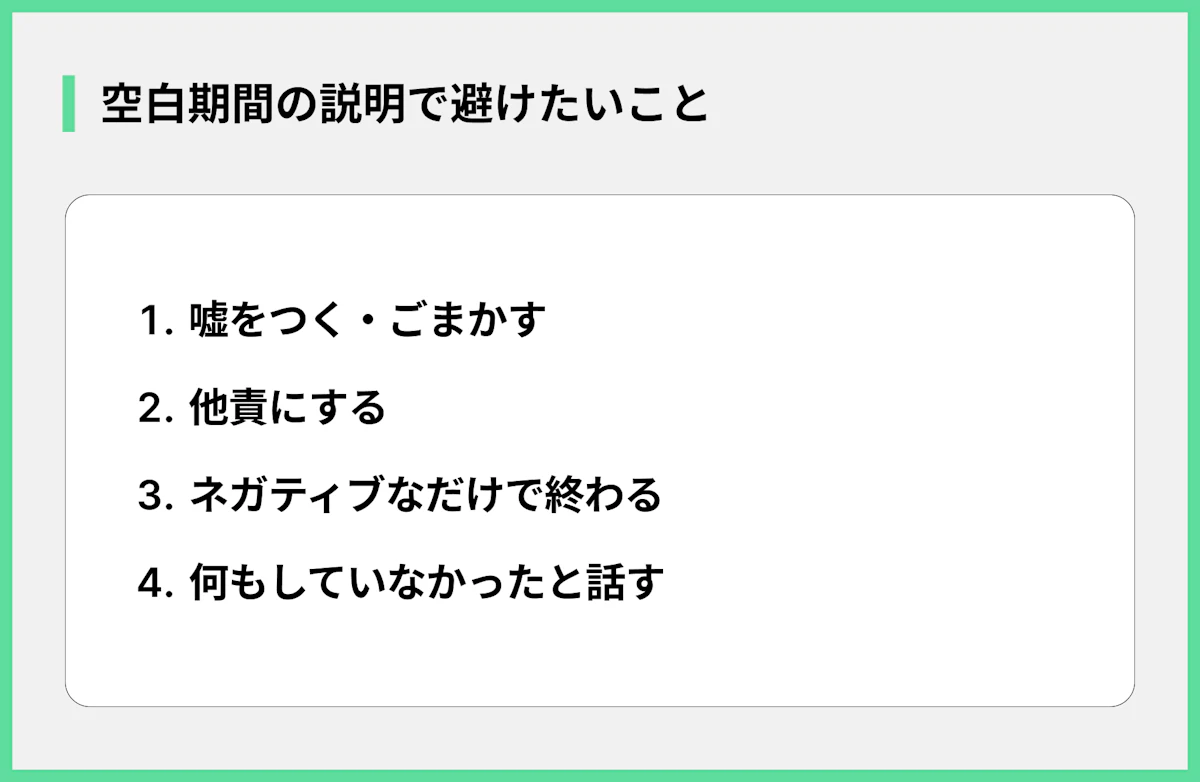 面接官が最も気にするのが「空白期間に何をしていたか」です。何もしていなかったと正直に話すのではなく、その期間に何を考え、どう過ごしていたのかを伝えられるように準備しましょう。例えば、「将来についてじっくり考える時間にしていました」「資格取得の勉強をしていました」など、正直に、かつ前向きな姿勢で話すことが大切です。ただ遊んでいた、寝ていた、という回答は避けましょう。