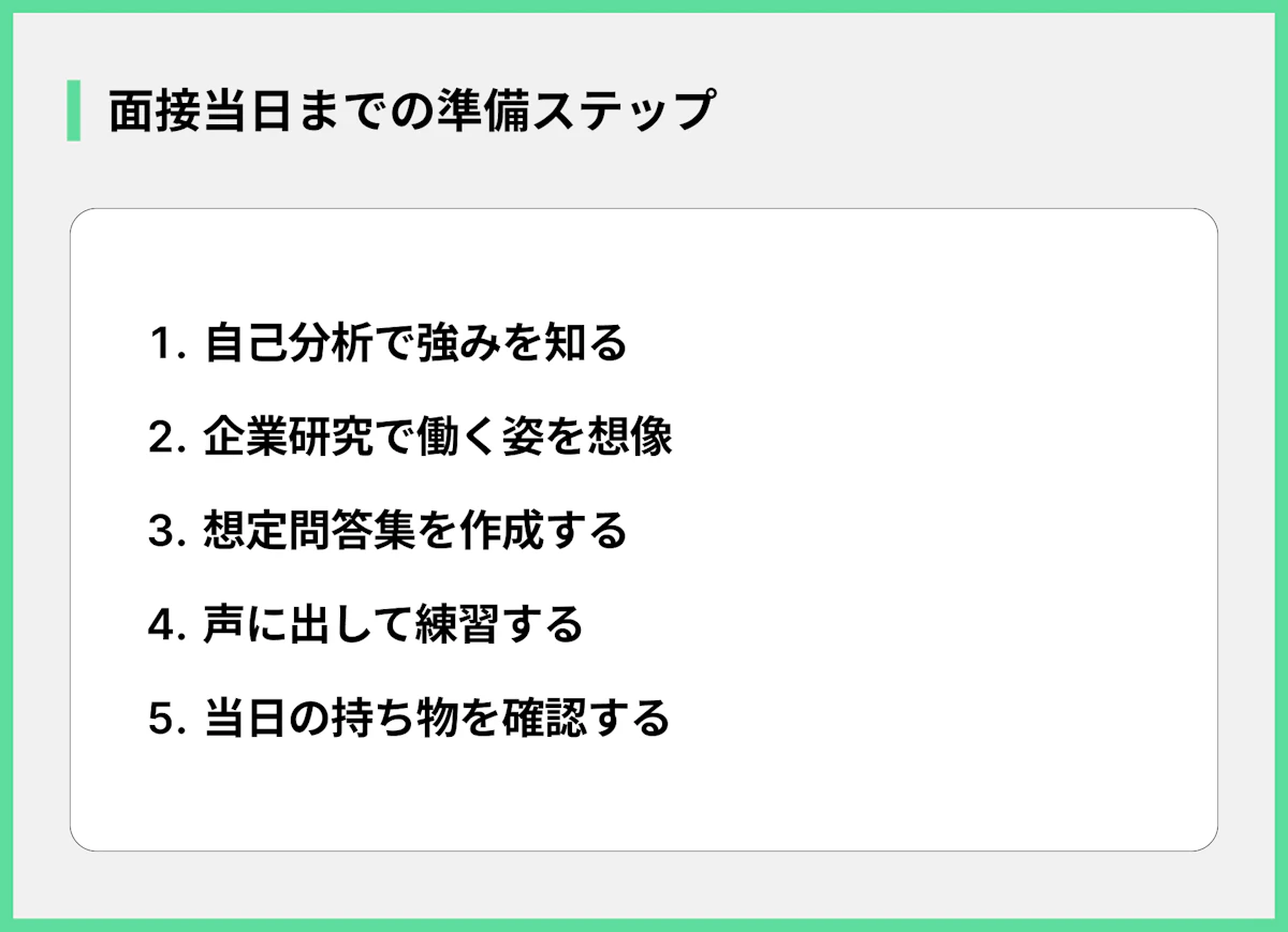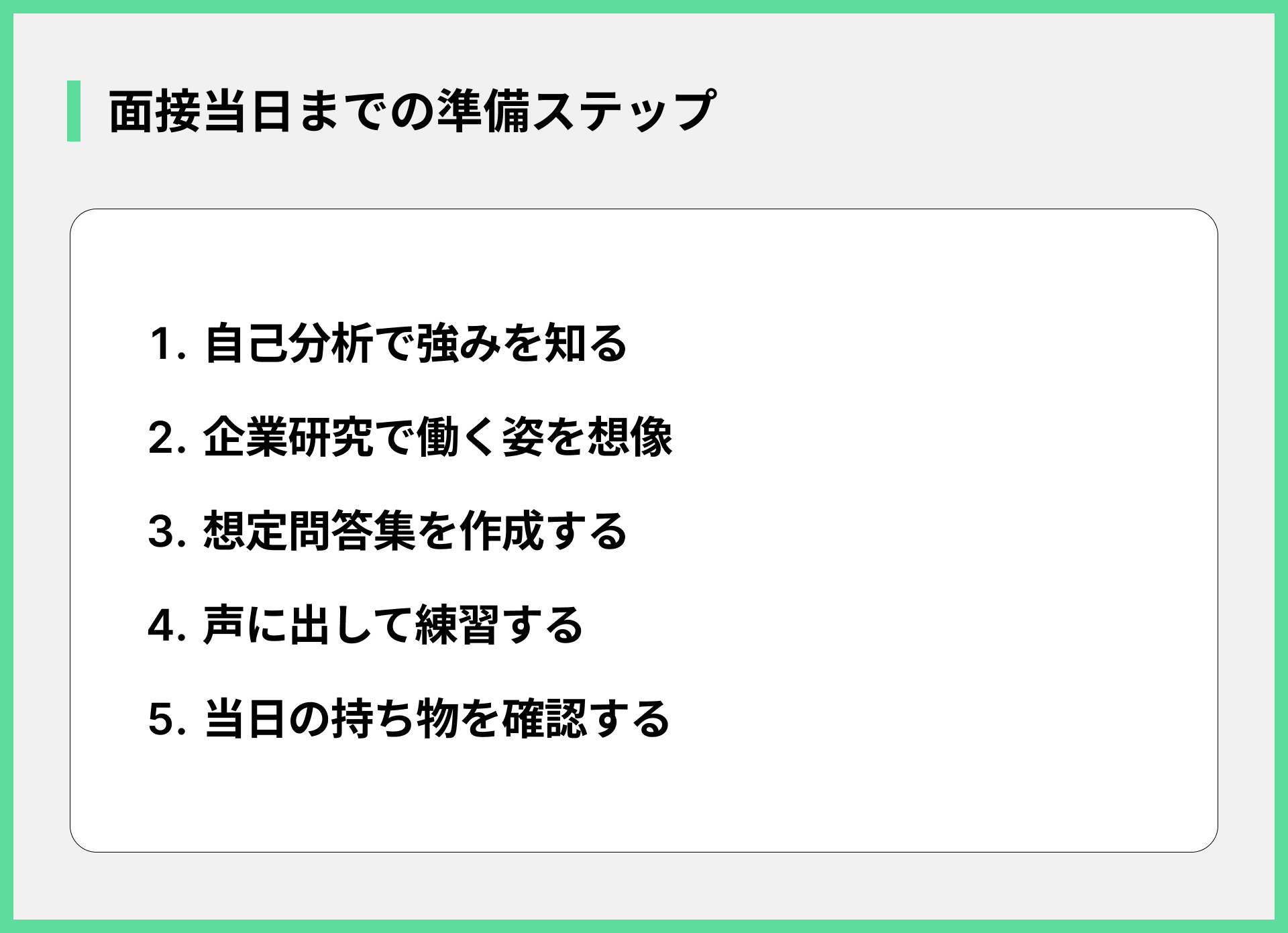 面接は、準備が9割と言っても過言ではありません。ぶっつけ本番で臨むのではなく、万全の対策をしておきましょう。最低限、以下の準備は済ませておくことをおすすめします。
