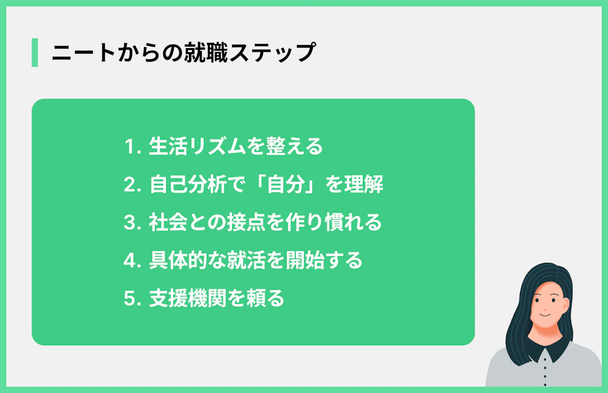 ニートの状態から就職を目指すことは、大きな挑戦ですが、決して不可能ではありません。何から手をつければ良いのか、どんな準備が必要なのか、不安に思う方も多いでしょう。この記事では、ニートからの就職を成功させるための具体的なステップを、準備段階から面接対策、さらには就職後のキャリアプランまで、網羅的に解説します。一人で悩まず、適切な方法とコツを知ることで、社会復帰への道は着実に開けます。NG行動を避け、自分に合った仕事を見つけるためのヒントも満載です。さあ、この記事を羅針盤に、新たな一歩を踏み出しましょう。