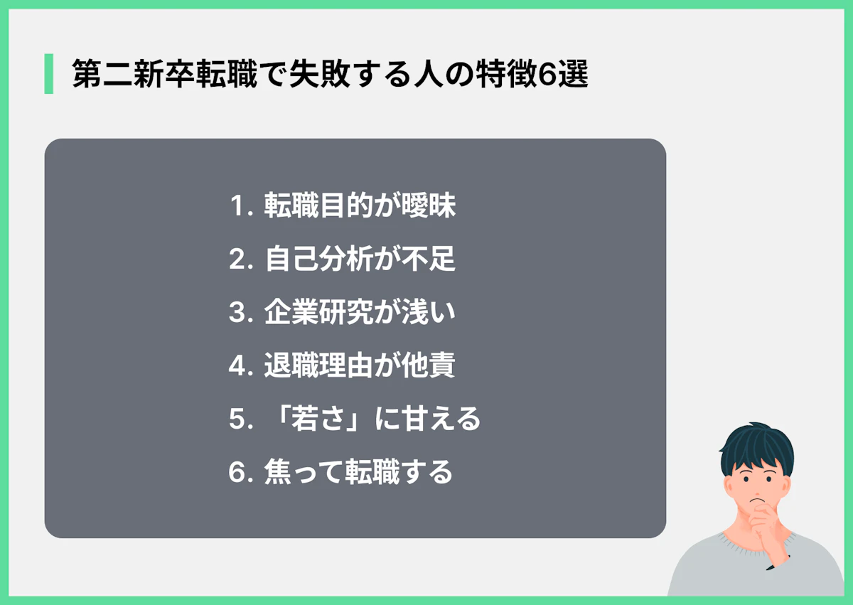 第二新卒の転職では、短い社会人経験の中から自分の強みやポテンシャルを抽出し、言語化してアピールすることが求められます。しかし、失敗する人はこの自己分析が決定的に不足しています。自分がこれまで何を経験し、何を学び、どんなスキルを身につけたのかを客観的に把握できていないため、応募書類や面接で具体的なエピソードを交えて語ることができません。その結果、「特に強みのない、意欲だけの若者」という印象を与えてしまい、他の候補者との差別化を図ることができずに選考で不利になってしまいます。