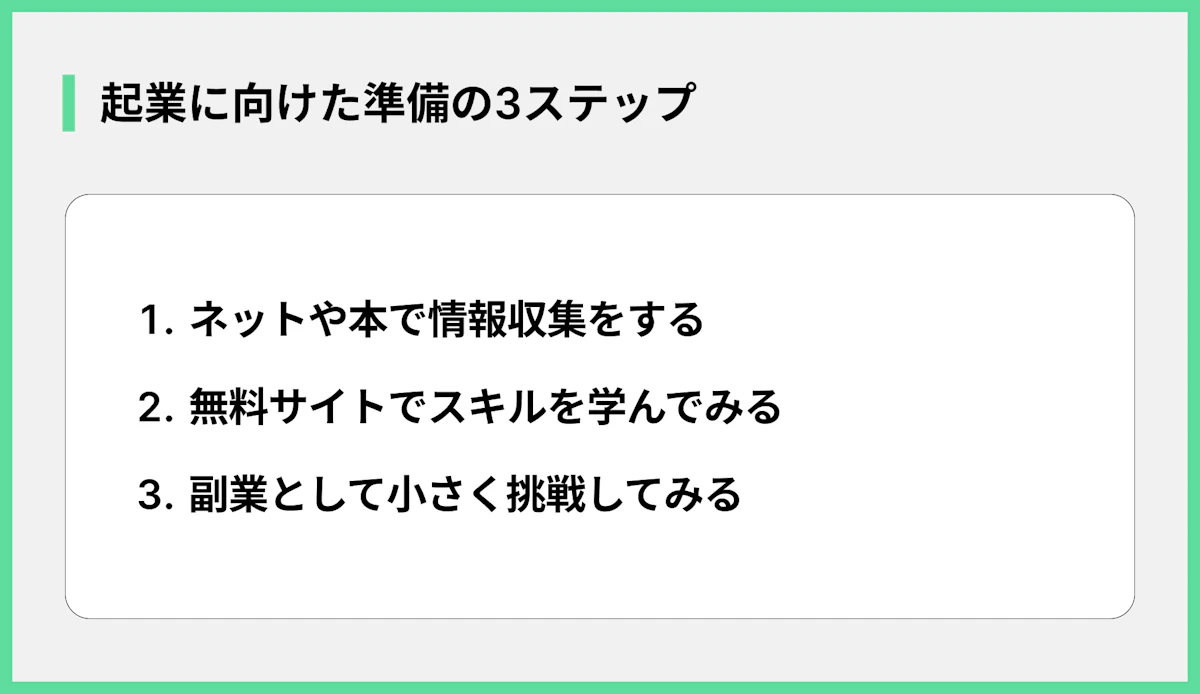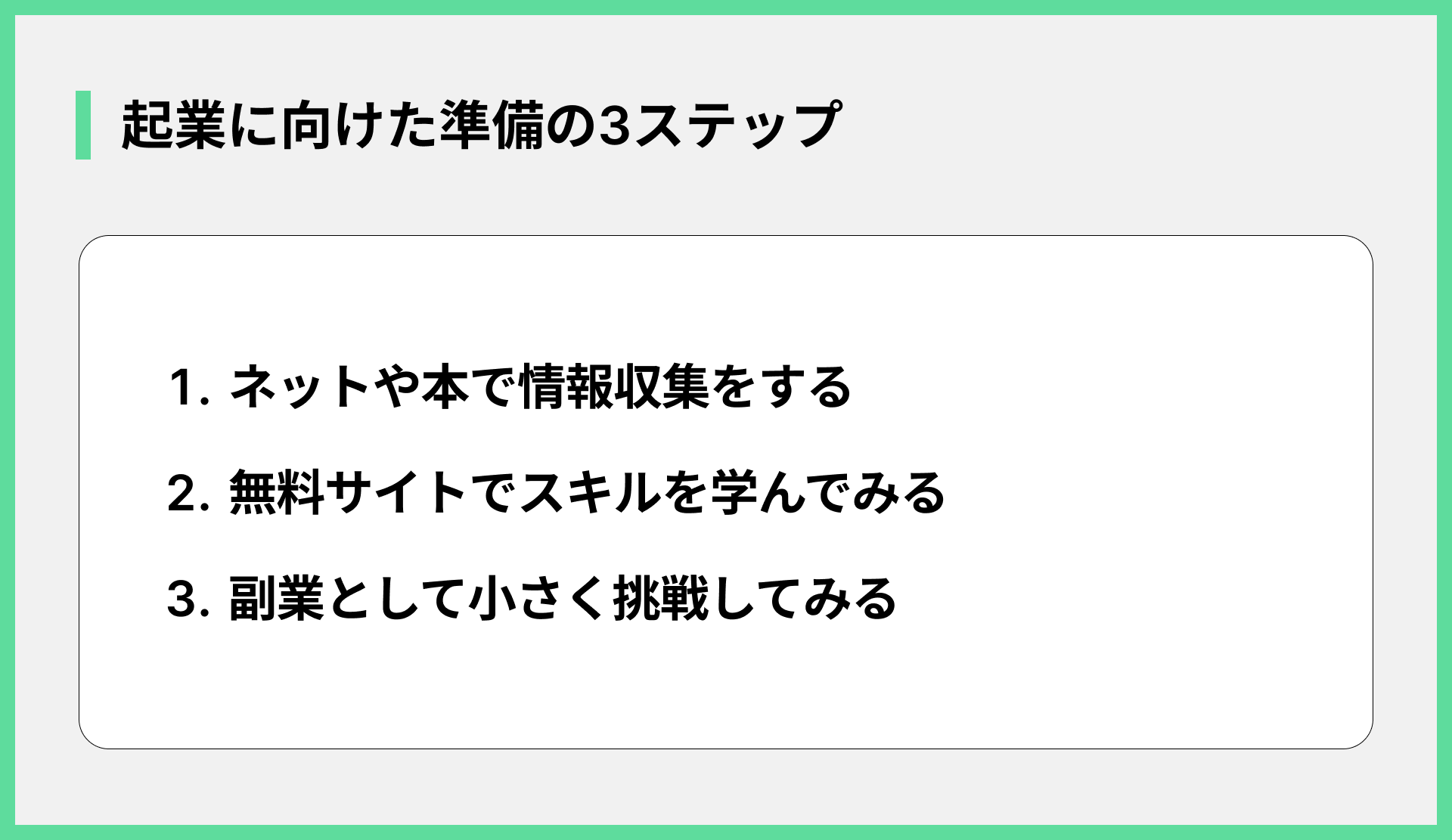 起業は、思い立ってすぐにできるものではありません。成功の確率を高めるためには、事前の準備が非常に重要です。焦らずに、今いる場所でできることから始めてみましょう。準備のポイントは以下の通りです。