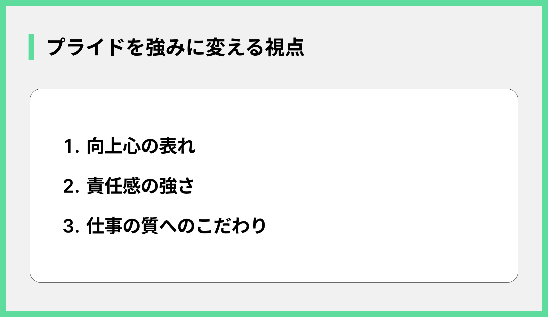 プライドが高いということは、自分の中に高い理想や目標を持っている証拠です。その向上心は、仕事の質を高めたり、スキルを習得したりする上での大きな原動力になります。「どうせやるなら良いものを作りたい」「もっと上手くなりたい」という気持ちは、成長には欠かせません。妥協しない姿勢は、特に専門的な知識や技術が求められる仕事で高く評価される可能性があります。
