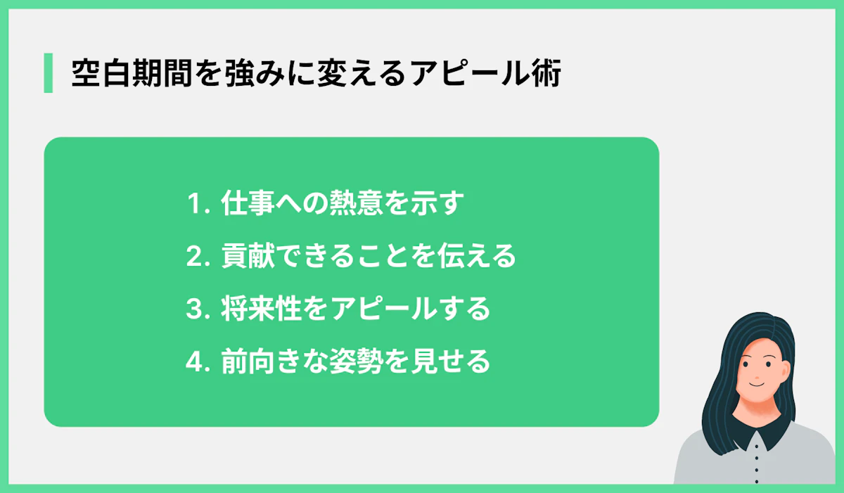 空白期間の事実を伝えた上で、その期間をどう過ごしていたかを前向きに説明することが重要です。採用担当者は「この人は空白期間に何をしていたのか」「働く意欲はあるのか」を知りたいと考えています。空白期間を前向きに伝えるための理由は以下の通りです。