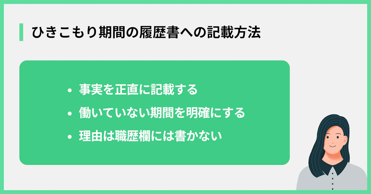 ひきこもりだった期間があると、履歴書の職歴欄に空白ができてしまい、どう書けばいいか悩みます。正直に書くと不利になるのではないかと不安に感じるかもしれません。ですが、書き方を工夫すれば、採用担当者にネガティブな印象を与えずに済みます。空白期間の書き方に関するポイントは以下の通りです。