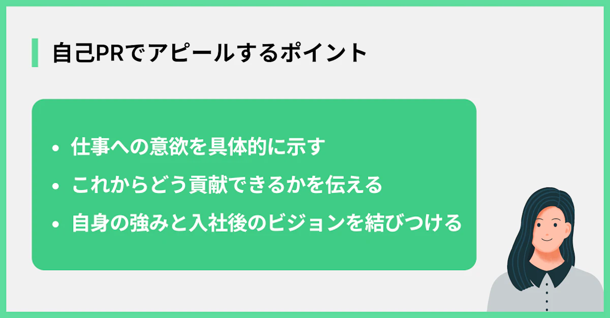 自己PRでは、入社意欲を具体的に示すことが大切です。「頑張ります」という言葉だけでなく、なぜこの会社で働きたいのか、なぜこの仕事に興味を持ったのかを自分の言葉で伝えましょう。企業のホームページなどをよく読み、共感した部分や魅力に感じた部分を盛り込むと、熱意が伝わりやすくなります。