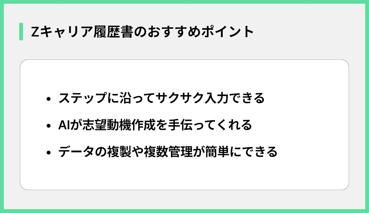 ここまで履歴書の書き方や面接のポイントを解説してきましたが、それでも一人で履歴書を完成させるのは大変だと感じるかもしれません。そんな時は、便利なツールを使うのも一つの手です。Zキャリア履歴書のおすすめポイントは以下の通りです。