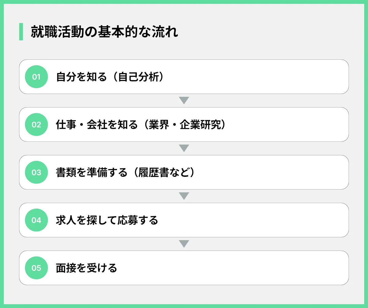 心配いりません。ここでは、就職活動の基本的な流れを、分かりやすく5つのステップに分けてご紹介します。この順番で進めていけば、きっとスムーズに進められるはずです。