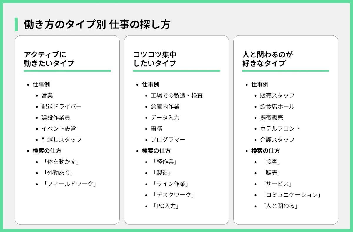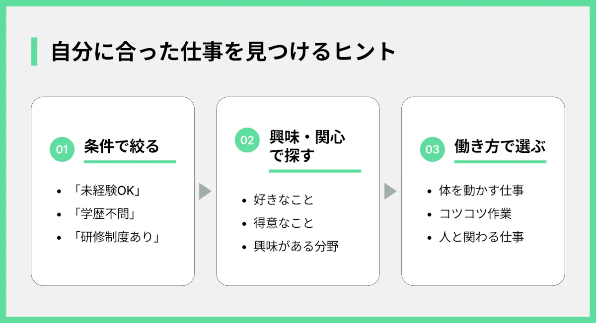 実際に働いてみる中で、「この仕事、意外と面白いかも」「もっとこんなことをやってみたい」という気持ちが芽生えてくることもよくあります。「まずはやってみる」という軽い気持ちで、少し視野を広げて求人を見てみましょう。