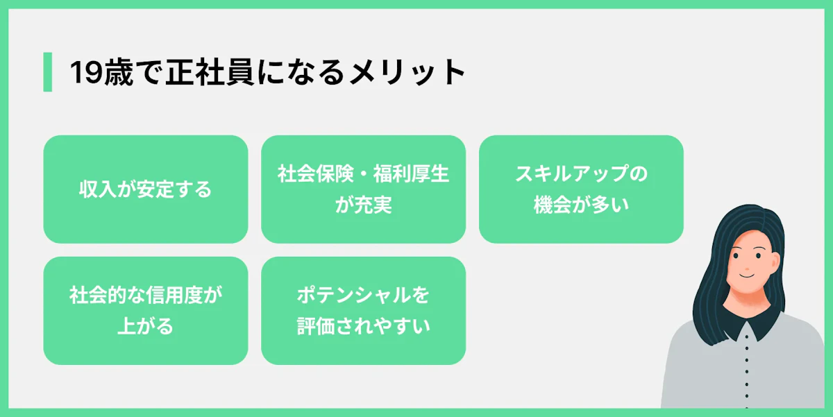 フリーターのリスクについてお話ししましたが、逆に、19歳という若さで正社員になることには、たくさんのメリットがあります。未来の自分のために、どんな良いことがあるのか見ていきましょう。