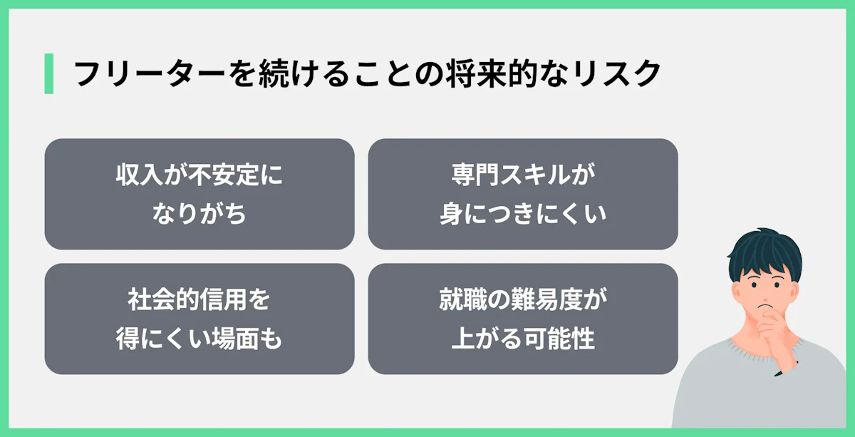 今のフリーター生活が自由で楽しかったり、特に困っていなかったりすると、「このままでもいいかな」と思うかもしれません。でも、将来のことを少しだけ考えてみると、フリーターを続けることにはいくつかのリスクも考えられます。