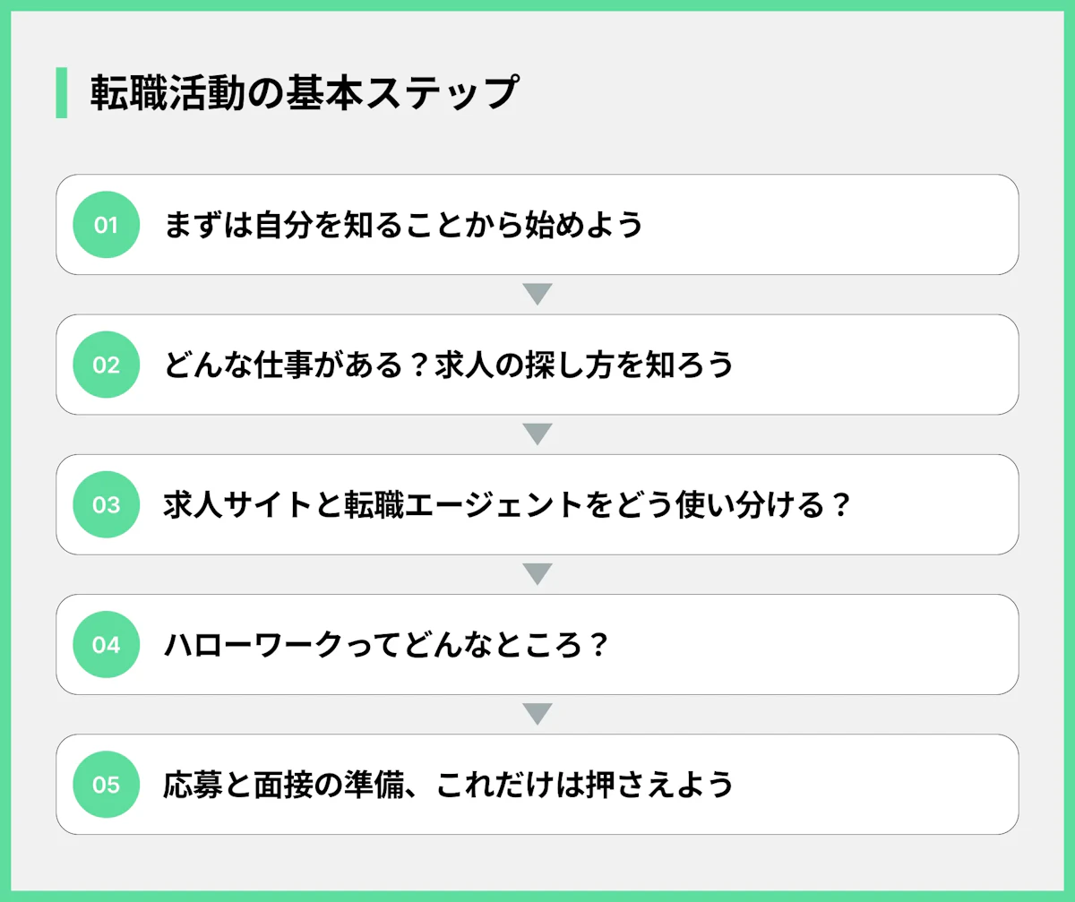「転職しよう!」と決めたら、具体的にどう動けばいいのでしょうか? ここでは、転職活動の基本的な流れをステップごとに見ていきましょう。