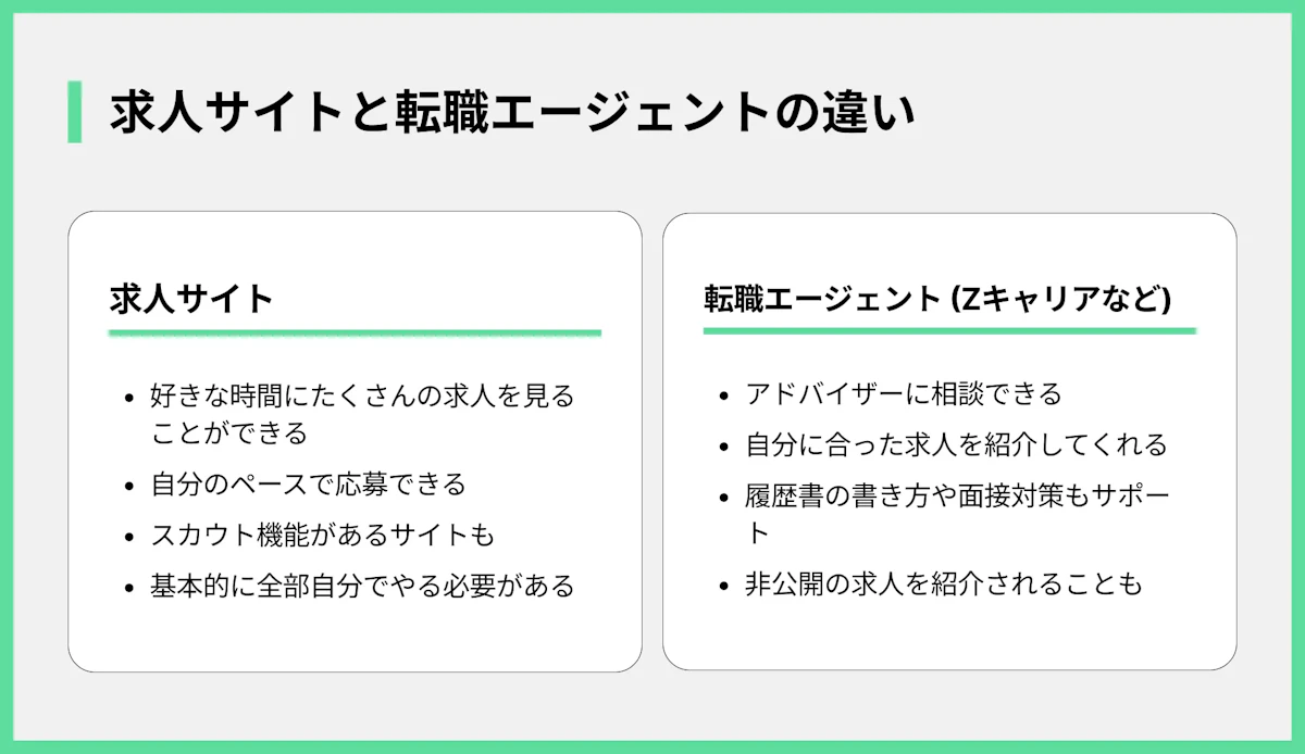 仕事を探す方法として、主に「求人サイト」と「転職エージェント」があります。それぞれの特徴を知って、うまく使い分けるのがおすすめです。