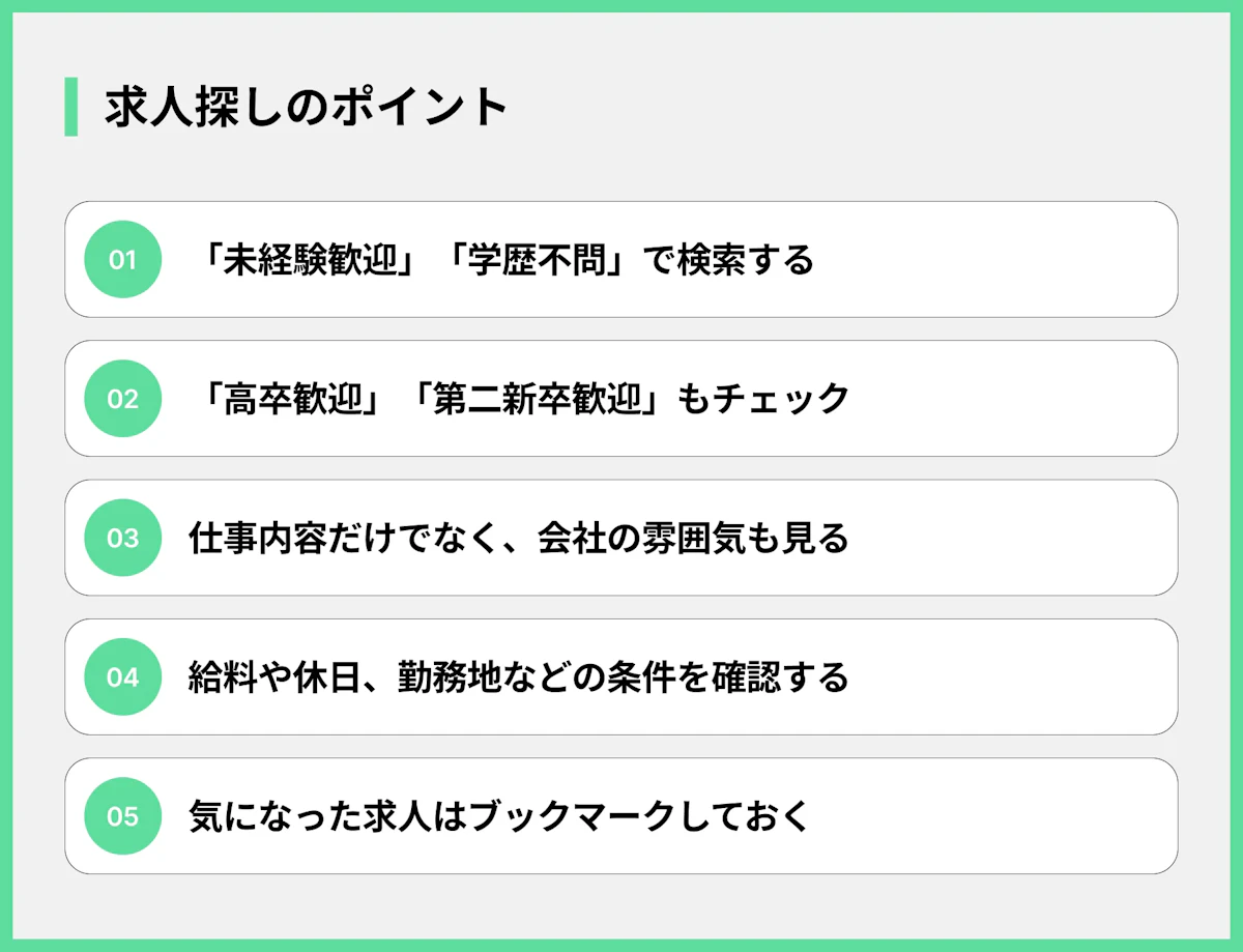 これらの仕事は、「未経験者歓迎」や「学歴不問」の求人が比較的多い傾向にあります。