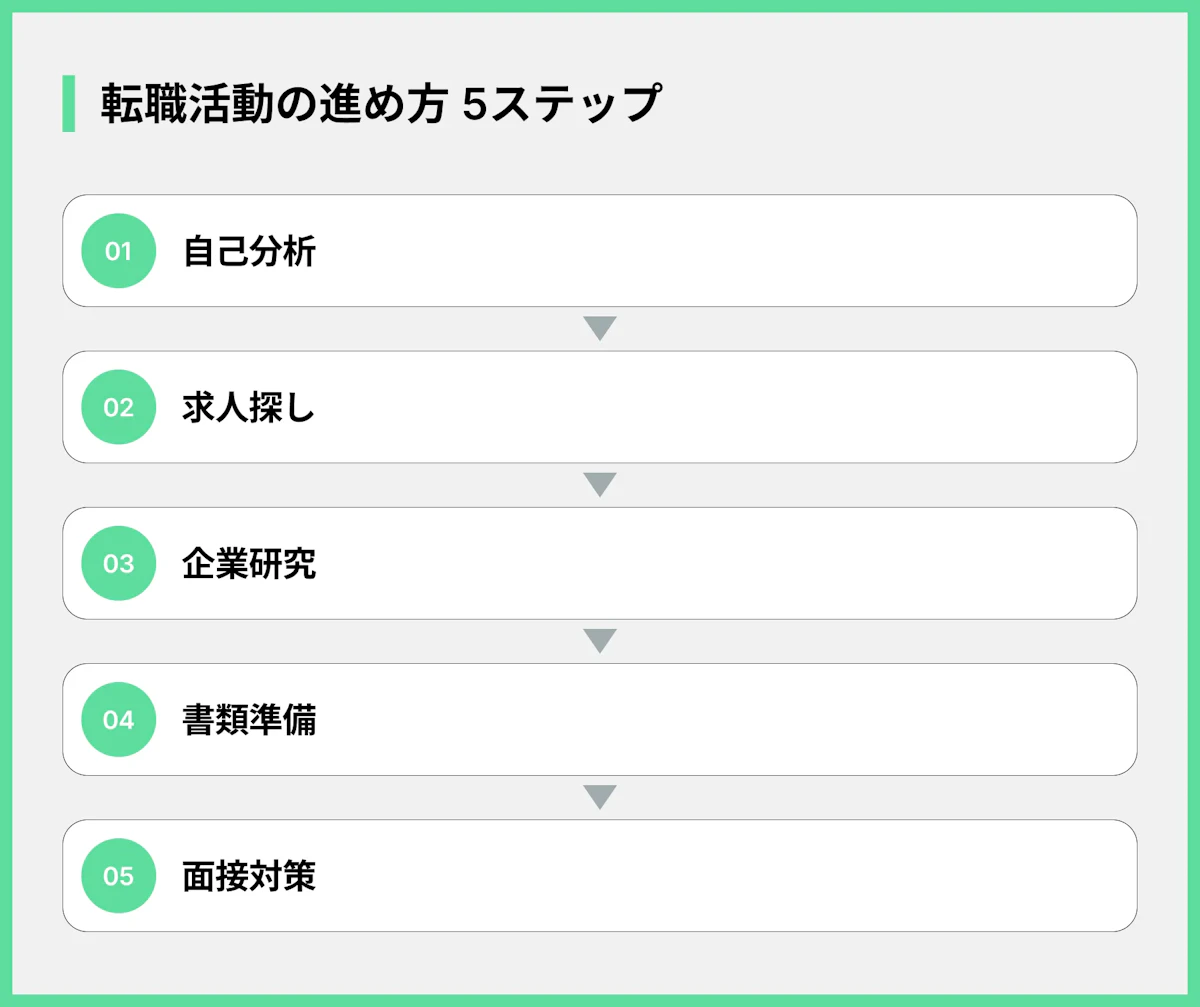 ここからは、転職活動の基本的な進め方を5つのステップに分けて紹介します。この流れに沿って進めれば、初めての転職でも安心です。