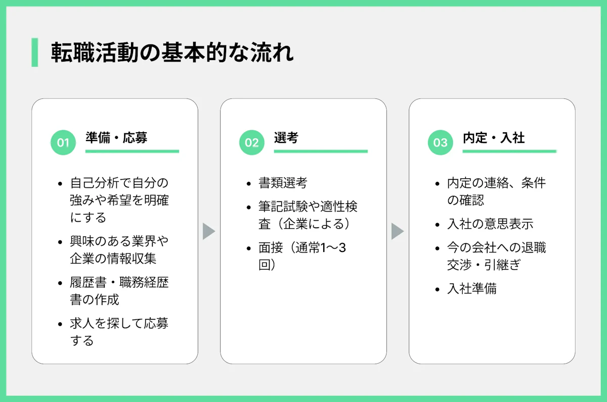 「転職しよう!」と決意してから、実際に新しい会社で働き始めるまでには、いくつかのステップがあります。ここでは、転職活動の一般的な流れを分かりやすく解説します。