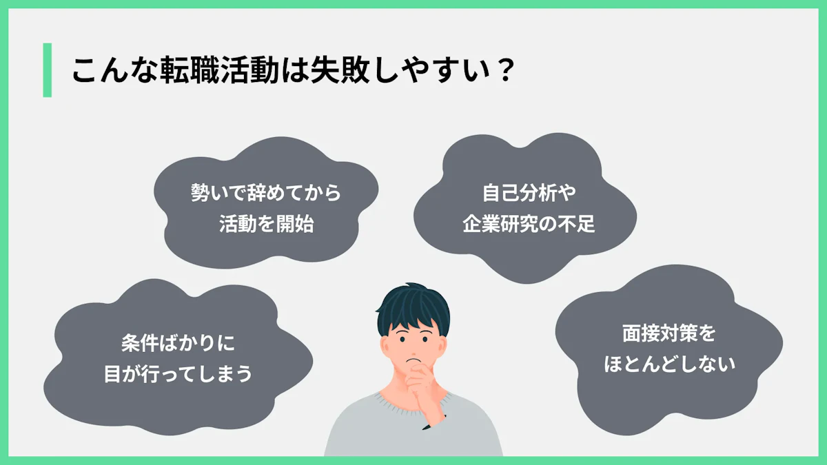- 在職中の活動を心がけ、焦らず、条件だけで決めないことが大切。