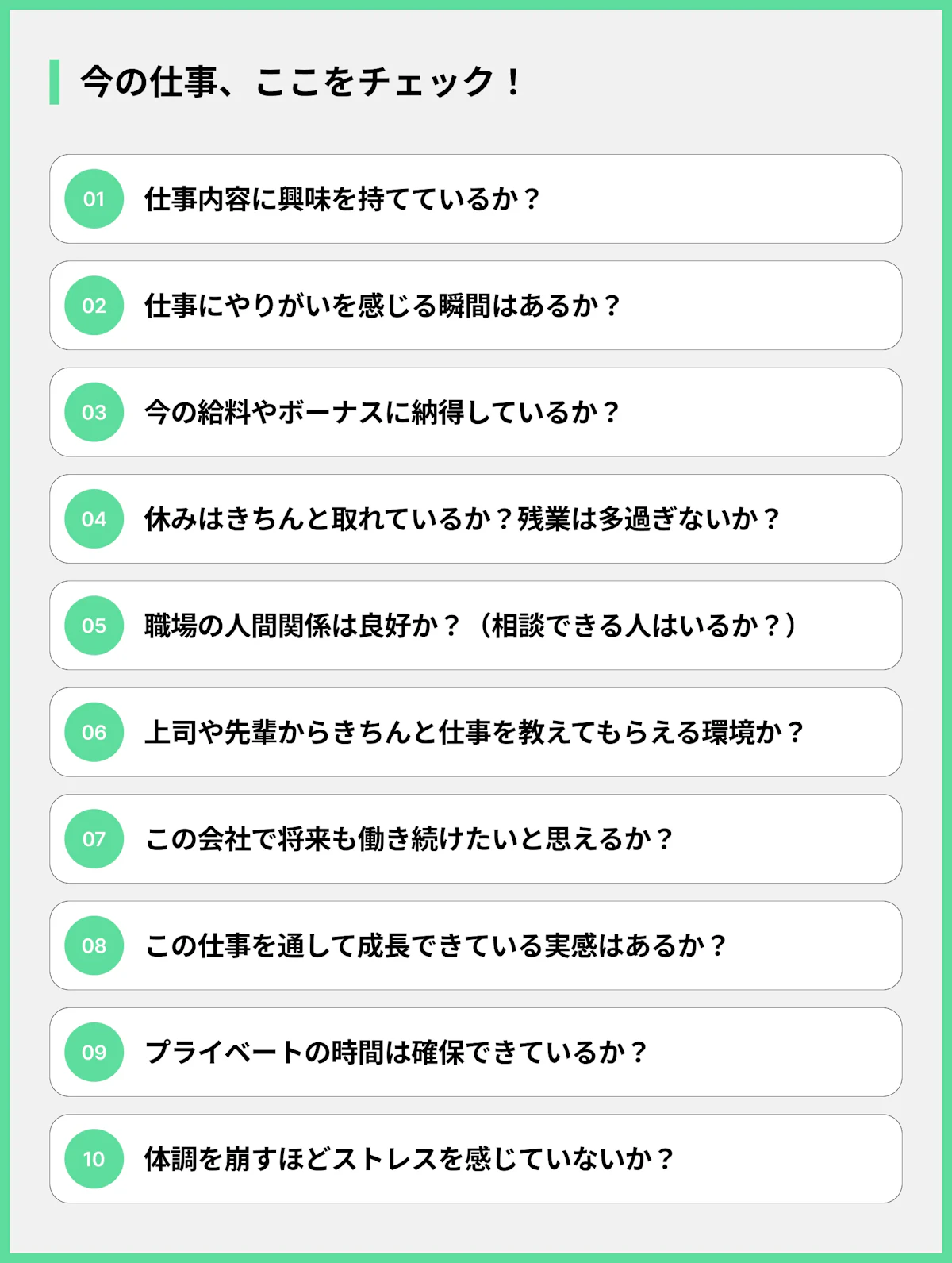 今の仕事に対する自分の気持ちを整理するために、以下の項目をチェックしてみましょう。